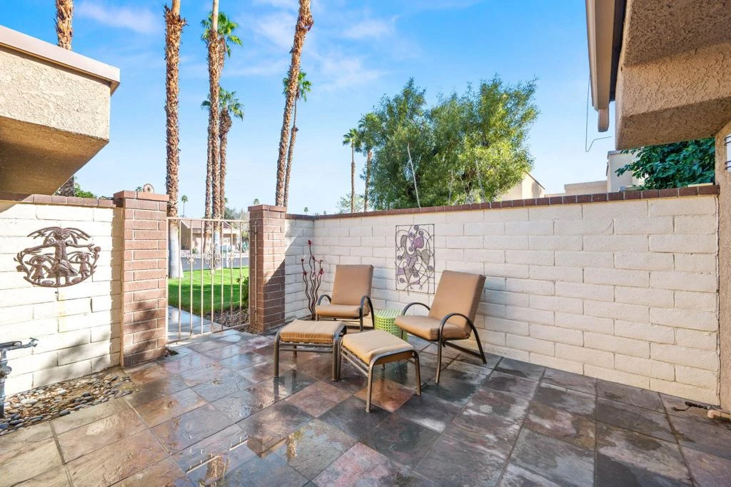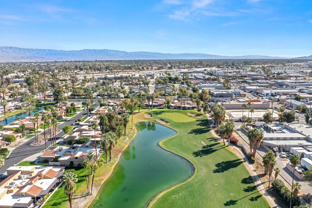 Nestled gracefully between the vibrant heart of downtown Palm Springs and the chic allure of El Paseo's shopping district, this charming two-bedroom, two-bath condo located in Cathedral Canon Country Club, Palm Springs is ready to welcome its next fortunate owner. As you step inside, you're greeted by soaring cathedral ceilings in the living room, bathed in natural light from clerestory windows. The living area flows effortlessly to a rear patio that offers panoramic views of the mountains, the golf course, and a tranquil lake, creating the perfect backdrop for relaxing or entertaining.The kitchen, with its stainless-steel appliances and a convenient pass-through to the dining area, invites you to enjoy meals with a view. The primary bathroom suite offers both a shower and a tub for those moments of relaxation, while the guest bedroom's sliding doors lead directly to a private, gated front patio. With a recently updated HVAC system and overhead storage in the attached two-car garage, the home combines comfort with practicality. Best of all, it's offered turnkey furnished--ready for you to walk in and start living your desert dream