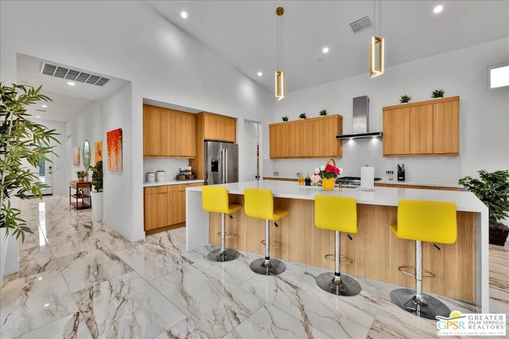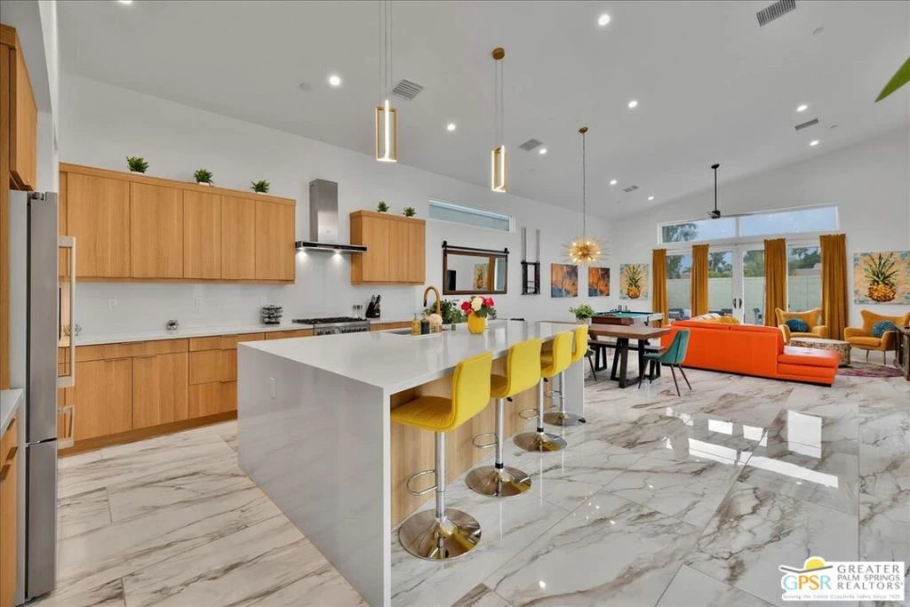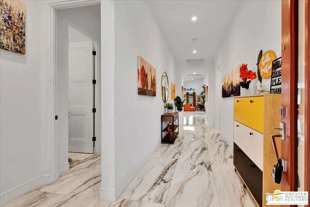 Welcome to MIRALON PALM SPRINGS! This guard-gated, single-story modern home offers a private pool, premium south-facing orientation, and stunning, unobstructed San Jacinto Mountain views on land you own. Designed for seamless indoor-outdoor living, this turnkey property at 841 Fountain Dr is fully furnished and move-in ready. Built in 2022, this modern home features 3 bedrooms, 3.5 baths, approx. 2,084 sq ft on a 6,970 sq ft lot. The open floor plan is bathed in natural light from clerestory windows and high ceilings. Enjoy mountain views from both inside and out. Highlights: Single-story living in a guard-gated, resort-style community; Private pool home with a south and west-facing yard; Outdoor entertaining area with a putting green, low-maintenance artificial turf, and desert landscaping; Leased solar with EV charging (helps reduce utility costs). Attached 2-car garage and dedicated laundry room. Every bedroom is ensuite, including a spacious primary suite with a double vanity and luxurious bath. The modern kitchen features an oversized, waterfall-edge island, a gas range, and clean finishes that flow seamlessly to the outdoor spaces. The oversized south-facing backyard is built for entertaining with a private pool and is perfectly oriented to capture the sun and dramatic mountain backdrop with no visible power lines. Short-term rentals are allowed (7-day minimum) per HOA/City rules, offering potential extra income. The community is designed around a modern eco-inspired master plan and "agri-hood" lifestyle (integrating green spaces/orchards). Enjoy morning walks and sunset strolls along community trails, olive groves, lakeside parks, and beautifully landscaped grounds. The clubhouse functions as a private wellness retreat with resort-style pools, a spa, cabanas, fitness/yoga facilities, and social spaces, including a cafe-style Wi-Fi hub and bar. Conveniently located near the amenities of Uptown, downtown Palm Springs, and Palm Springs International Airport (PSP). Value Notes: You own the land: Offering long-term control and value without land lease payments; Solar is a lease: Buyer to assume and verify terms for potential monthly utility savings. This is a rare combination of single-story living, a private pool, unobstructed views, and the full Palm Springs lifestyle. Ask the listing agent for the full features list and showing details.