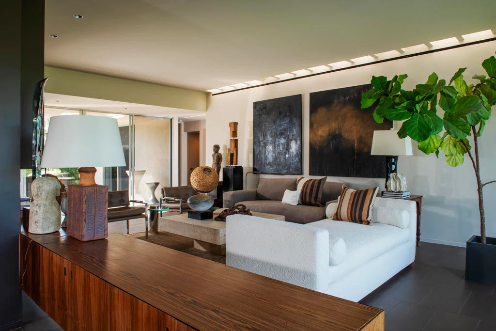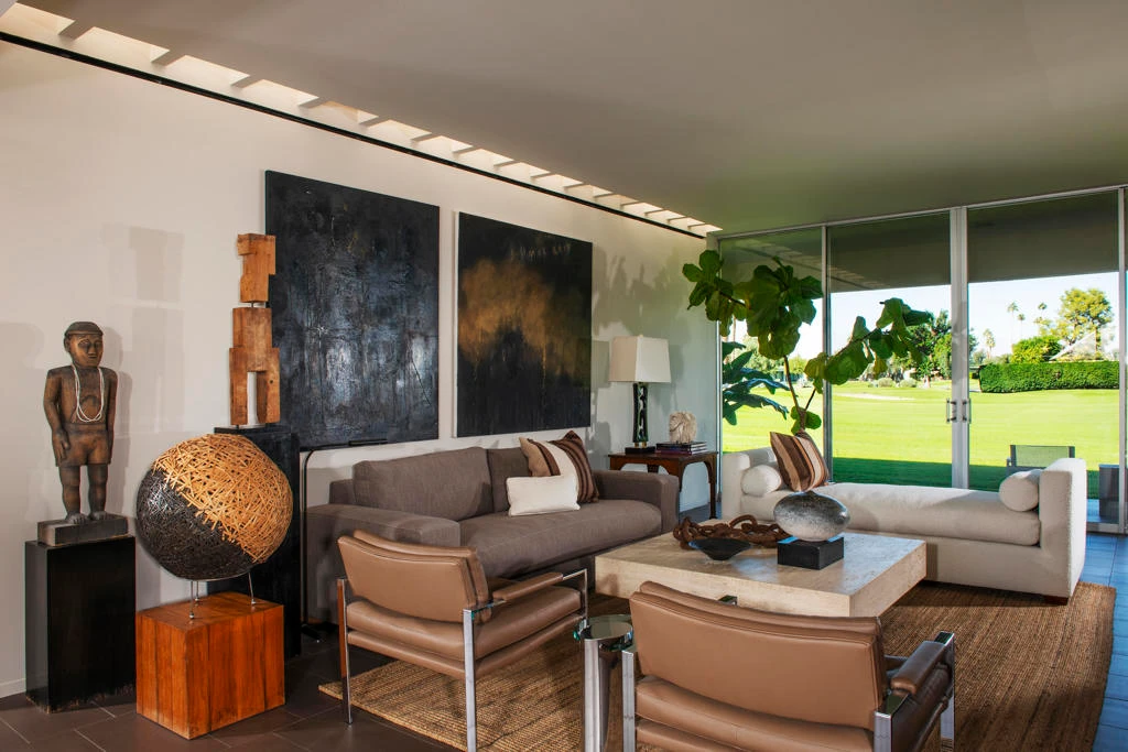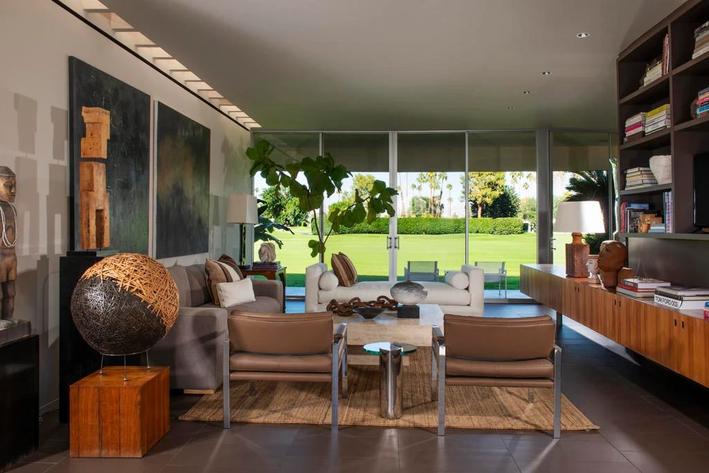 Situated in a prime location with sweeping triple fairway views, this mid-century gem, originally designed by renowned modernist Richard Harrison, was reimagined by noted architect Robert Kleinschmidt. Featured in Palm Springs Life and Interior Design magazine, the home epitomizes desert sophistication. Step into a sun-drenched space, where natural light pours in through a dramatic linear skylight that stretches across the living room. A custom cantilevered rosewood credenza thoughtfully divides the living and dining areas, adding a touch of artistry. Each room seamlessly connects to the outdoors, with floor-to-ceiling sliders that open onto either a serene private patio or a lush inner courtyard. The home's porcelain tile, laid in a striking ashlar bond pattern, exudes contemporary elegance while flowing effortlessly from interior spaces to exterior tranquility, creating a harmonious connection to the surrounding landscape. At the heart of the home, a modern chef's kitchen awaits, outfitted with premium Miele and Fisher & Paykel appliances, custom wooden cabinetry and sleek new quartz countertops--an ideal space for culinary creativity. New ceiling fans and discreet HVAC diffusers ensure optimal comfort in every room. Both spacious bedrooms feature lacquered cabinetry, built-in shelving, and ample closet storage, offering a blend of practicality and style. An EV charger is conveniently included in your carport. Plus, your pool escape and clubhouse are just nearby. Past the 24-hour guarded gate, 'The Gem of the Desert' offers a unique elevated lifestyle with its Ted Robinson-designed 18-hole executive golf course, 15 pools and spas. The lively William Cody designed clubhouse is waiting to welcome you to its formal dining room, casual cocktail lounge and a terrace overlooking the famous Seven Lakes fountain. Welcome home!