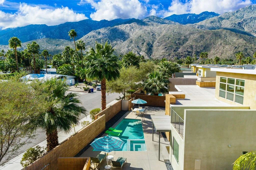 Bordering the iconic Twin Palms neighborhood in Palm Springs, this is a rare offering within the boutique Oceo community--where only nine single-family homes exist. Designed by renowned architect Jim Cioffi, AIA, this home sits on an expansive lot that stretches from Oceo Circle South to Twin Palms Drive--an uncommon footprint that creates exceptional space and separation between neighbors. The primary views overlook the established, single-story homes of Twin Palms, enhancing both privacy and architectural charm.A marble and French limestone entry sets a sophisticated tone, opening to a dramatic great room defined by soaring ceilings, clerestory windows, warm wood floors, and expansive sliding glass doors. The seamless indoor-outdoor flow is quintessential Palm Springs--anchored by a south-facing, professionally restored saltwater pool and spa that enjoy sun all day long. Panoramic San Jacinto Mountain views frame the backdrop, while a generous wraparound patio invites effortless outdoor entertaining.The main-level primary suite is a private retreat with direct pool access and stunning mountain views. Its marble-clad bath features a sunken soaking tub, oversized walk-in shower with dual shower heads, dual vanities, custom cabinetry, and a spacious walk-in closet. Also on the main level: a dedicated dining area with wet bar, a sleek modern kitchen equipped with BOSCH built-in microwave and oven, BOSCH lighted vent hood, five-burner gas cooktop, oversized KitchenAid refrigerator, pantry, powder room, and a separate laundry room with sink. A gas fireplace with logs adds warmth and ambiance to the living space.Upstairs, two junior ensuite bedrooms offer high ceilings, private baths, and expansive views. One suite features a sitting area, large walk-in closet, and access to a south-facing sun deck showcasing sweeping 180-degree vistas of Twin Palms' celebrated mid-century architecture and surrounding mountains.Built in 2015 and lovingly maintained by its original owner--never rented--this home blends modern efficiency with timeless design. Features include owned solar, dual-zoned Carrier HVAC, a Bradford White 75-gallon water heater, Hague Watermax filtration system, custom Hunter Douglas blinds, authentic Big Ass Fans throughout, wood flooring, and an attached two-car garage. Approximately $20,000 in thoughtful upgrades further elevate the home's comfort and style. Low HOA's of $312/mo.