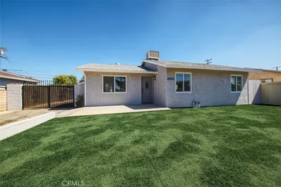 Welcome to this fully renovated two bedroom one bath home located on a large 8,386 square foot lot. The property's interior and exterior have recently been painted. Enter in to a good size living room, then into the kitchen which features a stove and newer microwave. Both bedrooms are good size and have a walk in closet. The bathroom has a newer vanity and sink, also a shower over tub. The laundry room is adjacent to the kitchen and has washer & dryer hookups. The one car garage has been converted to living area. The property has laminate flooring throughout, double pane windows (except in the garage conversion), and central air & heat. The large lot is perfect for RV parking or you can build an ADU or Guest House. FHA and VA Buyers are welcome. This property would also be perfect for an investor looking for rental income. Close to the 14 Freeway, walking distance to the Clock Tower Metrolink Station and very close to the Antelope Valley Mall and the restaurants that the mall has to offer. A new air conditioner unit was installed on 09/03/2025.