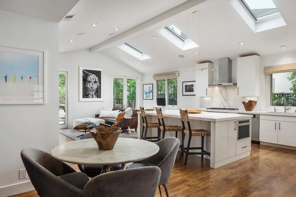 This chic Crescent Park home blends transitional design with an open, light-filled floor plan, offering stylish and comfortable living in one of Palo Altos most desirable neighborhoods. A covered bluestone porch creates a warm and inviting entry, while inside, a stunning great room impresses with vaulted ceilings, remote-controlled skylights, built-in speakers, and dual doors opening to the rear. The chefs kitchen boasts high-end stainless steel appliances, an oversized island with breakfast bar, and custom cabinetry. An open dining and bar area features a pantry and a U-Line wine refrigerator. The step-up primary suite offers a window seat, tray ceiling, dual WICs, and a spa-like bath w/ Carrara marble finishes, while two add'l bedrooms are privately situated off a separate wing. Additional highlights include oak hardwood flrs, dual-pane windows, custom grasscloth window treatments, a stylish hall bath w/ heated floors, a generous laundry/mudroom, and smart-home features including a Nest thermostat. Eco-conscious landscaping includes native plantings, while the private backyard features a natural stone patio, built-in speakers, faux lawn, landscape lighting, and a fire table. Ideally located near Stanford University, shopping, dining, parks, and top-rated schools.