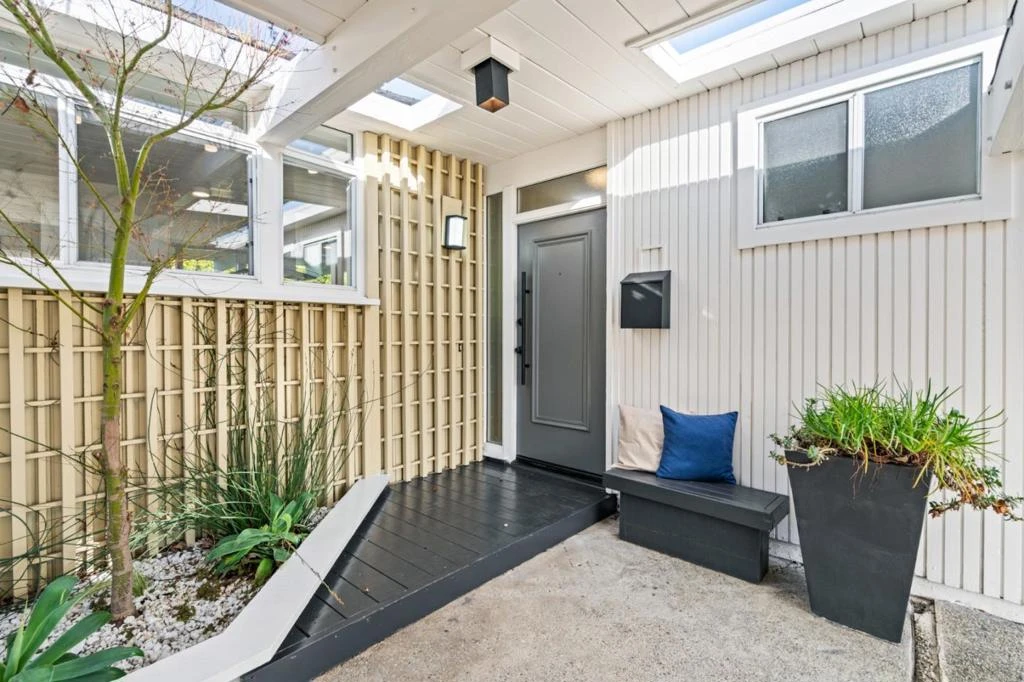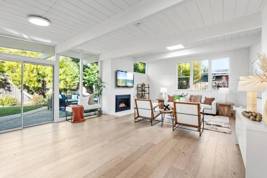 Tucked within the quiet Circles of Palo Altos Fairmeadow neighborhood, this thoughtfully refreshed home offers a refined take on mid-century living, where light, simplicity, & indooroutdoor connection define the experience. Expansive windows, skylights, and a private central courtyard fill the home with natural light, creating an airy and serene atmosphere throughout. The open-concept living, dining, & kitchen areas flow seamlessly, ideal for everyday living and relaxed entertaining. Clean architectural lines, exposed beams, & newly installed white oak floors provide a timeless, cohesive backdrop. The remodeled kitchen blends form and function with sleek white cabinetry, a breakfast bar, stainless steel appliances, & honed gray countertops. Large glass sliders extend the living spaces outdoors to private side and rear yards featuring a spacious shaded patio and drought-tolerant landscaping framed by mature trees. Bedrooms are comfortably scaled and quietly situated, while the updated bathrooms reflect a fresh, contemporary aesthetic. A covered carport with an attached storage room. Conveniently located near major commute routes, Caltrain, Stanford, and leading tech campuses, and served by acclaimed Palo Alto schools.