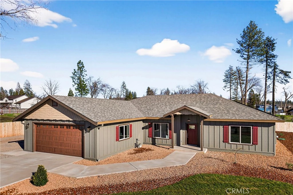Brand new 3-bedroom, 2-bath home in the heart of Paradise on a rare .52-acre lot, featuring massive RV parking and space to expand and customize with room for a workshop, additional garage, or pool. Built by longtime local licensed contractor Harding Enterprises, known for quality craftsmanship and thoughtfully designed homes. This 1,829 sq. ft. residence is loaded with high-quality upgrades, including an owned solar system, Mitsubishi inverter-driven heat pump, extra insulation, and an all-electric design—delivering exceptional comfort, efficiency, and long-term energy savings. Set well back from the street, the property offers excellent curb appeal, an oversized concrete driveway, and added privacy. Inside, the split-bedroom floorplan provides excellent separation and flow, enhanced by real wood flooring, ceiling fans, and stylish fixtures throughout. The gourmet kitchen features high-end GE-Cafe series appliances, double oven, generous counter space, and a walk-in pantry. A custom media cabinet with fiber service supports today’s technology needs. The primary suite serves as a private retreat with a spa-inspired en-suite bath, oversized walk-in shower, dual sink vanity, and spacious walk-in closet. Additional highlights include an upgraded front door with Kwikset smart lock, attached 2-car garage with epoxy-finished floor, wide concrete walkways, rear concrete patio, and an attractively landscaped yard ready to enjoy. Opportunities like this—new construction on an oversized lot with RV parking and room to expand—are increasingly rare in Paradise. Schedule your private tour today.