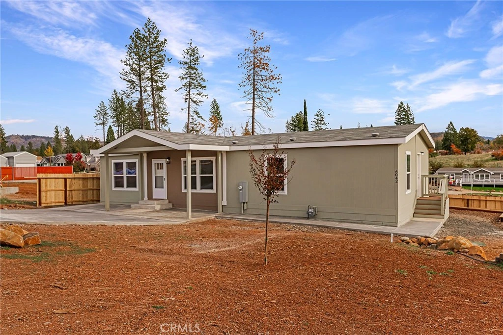 Welcome to your new home!!! Located at the end of a quiet and popular neighborhood in Paradise.This never lived in before, 2022-built manufactured home offers 3 spacious bedrooms, 2 full bathrooms, and a versatile flex space—ideal for a home office, den, or playroom. Spanning 1,475 square feet, the open-concept layout features a modern kitchen equipped with a large island, stainless steel appliances, and laminate countertops. The primary suite boasts double sinks and a walk-in shower, providing a luxurious retreat. Additional interior highlights include ceiling fans, laminate and carpet flooring, and a dedicated laundry room. Situated on a generous 0.54-acre lot, the property offers ample outdoor space for gardening, recreation, or potential additions like a garage or workshop. Enjoy serene mountain and neighborhood views from the charming covered front porch. The home is equipped with central heating and air conditioning, and a new septic. This perfectly located, priced to sell home will not last long. Schedule your showing today!