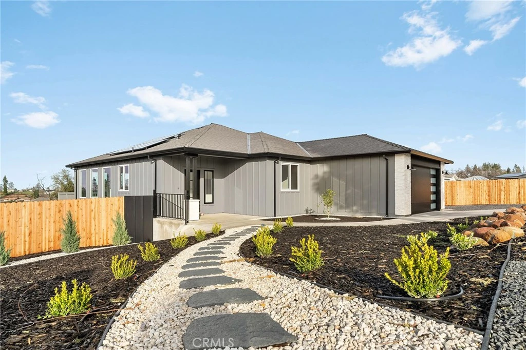 Welcome to this stunning new construction home located in lower Paradise, featuring 3 bedrooms and 2 bathrooms on a spacious lot, ideally positioned to capture serene canyon views along with breathtaking sunrises and sunsets. From the moment you arrive, the home makes a strong first impression with a modern architectural style that blends clean lines, textured finishes, and thoughtful landscaping. The garage design with horizontal glass panels, stone accents, a wide driveway, and mature trees creates a polished yet welcoming curb appeal, setting the tone for the cohesive design found throughout the home. Step inside to an open-concept floor plan where the kitchen takes center stage, showcasing an oversized island with a waterfall-style countertop and sleek contemporary finishes—ideal for entertaining and everyday living. Designed with the home chef in mind, the kitchen also features a spacious walk-in pantry, offering ample storage and easy access to ingredients and essentials. The kitchen flows effortlessly into the light-filled living area, where wide-plank flooring and custom windows frame the surrounding landscape and flood the space with natural light. A custom glass door opening to the deck visually pulls the outdoors in, extending the living space onto the expansive deck—perfect for dining, entertaining, or enjoying peaceful canyon views. Privately situated, the primary suite offers a serene retreat with a spa-inspired ensuite featuring a soaking tub, walk-in shower, spacious double vanity, and a generous walk-in closet. A dedicated indoor laundry room designed for maximum practicality and storage adds everyday convenience, while the fully landscaped front yard includes irrigation and the backyard remains a blank canvas ready for your vision. Additional highlights include a new septic tank, owned solar, pre-wiring for security cameras, a large crawl space for ample storage, and extra parking with flexibility for RV parking or additional vehicles. This thoughtfully designed home blends modern comfort, functionality, and scenic beauty—ready to welcome you home.