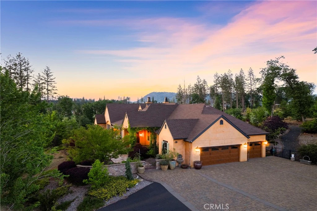 Rare find property that's simply put, Better Than New! A property of this stature would cost you millions to rebuilt and its tucked away in a peaceful, private setting just minutes from town, in one of the only gated neighborhoods in Paradise. This exquisite French Country estate blends refined craftsmanship with thoughtful design. Approximately 3.08 Acres of land, boasts 3 bedrooms, 4 bathrooms, and an office, this home offers a spacious and highly functional floor plan. From the moment you enter, you will notice the soaring vaulted ceilings, richly detailed wood-beams, custom built-ins, & a wood-burning fireplace with a cast-concrete hearth. Australian walnut flooring throughout, creating a seamless connection to the gourmet chef’s kitchen, complete with soapstone countertops, knotty alder cabinetry, a Wolf cooktop, Dacor double ovens and hood, Sub-Zero-style refrigerator, a brand new KitchenAid dishwasher, large prep island with bar seating and second sink, and a walk-in pantry. The primary suite is a real retreat, featuring a spa-like en-suite bathroom and a walk-in closet. Two additional guest bedrooms are tucked into a separate wing of the home, each with their own walk-in closets & shared Jack & Jill bathroom. Recently updated with freshly painted cabinetry and interior spaces, the home also includes a host of upscale amenities such as central vacuum, a whole-house stereo system, whole-house fan, water filtration system, radiant wall-mounted heating panels, custom drapery and window coverings, elegant fixtures, and wood casement windows. The attached three-car garage includes a storage room and is complemented by wood-look garage doors, a paver stone driveway, and a gated entrance. The property is equipped with 30 and 50 Amp RV hookups & a generator-ready setup with transfer switch. Outdoor living is just as impressive, featuring a slate tile patio beneath a pergola with a wood-burning fireplace and calming fountain—ideal for alfresco dining or gatherings with friends. A second patio at the front of the home provides sweeping territorial views, a powered sunshade, & another elegant fountain. The grounds are a lush sanctuary filled with blooming gardens, vibrant landscaping, & many mature trees including oaks, pines, Japanese maples, apple, pear, plum, fig, cherry, apricot, lemon, & lime. Stone paths lead to a secluded pergola-covered view patio, offering yet another place to take in the beauty of the surroundings. Truly a place to call home!