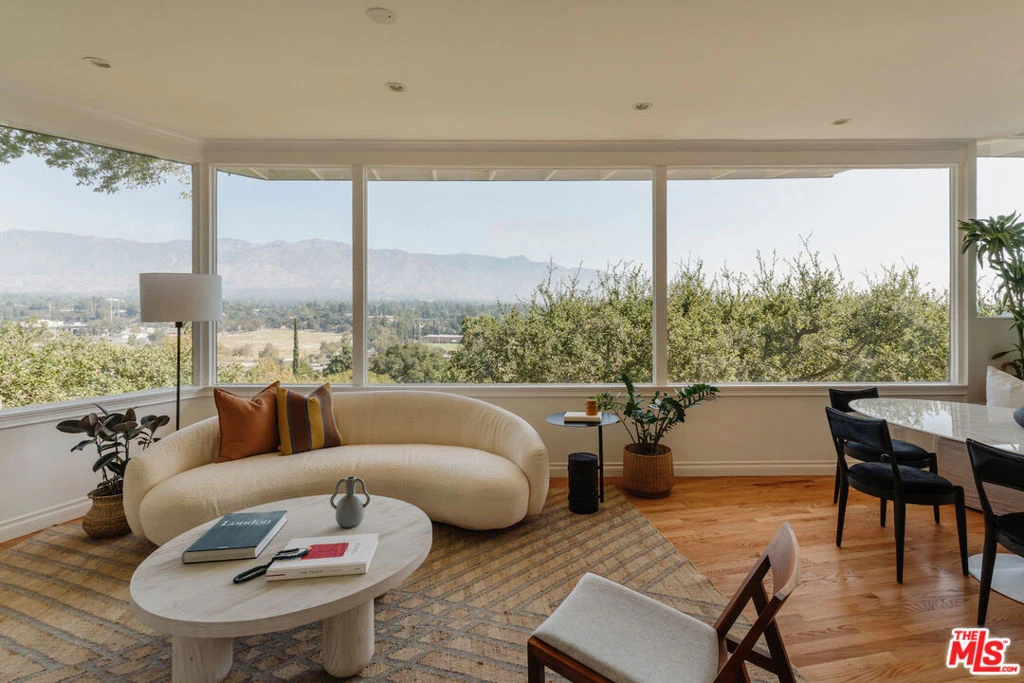 Perched on a 14,000 sf lot, this architectural work of art by W. Melville Garten offers the ultimate in privacy and refinement. Located in Pasadena's coveted Linda Vista neighborhood, this 3-bedroom, 3-bath with a guest house commands breathtaking views of the San Gabriel Mountains and the iconic Rose Bowl. Expansive windows flood the open living and dining areas with natural light, framing uninterrupted vistas that blur the line between indoors and out. At the heart of the home, the chef's kitchen boasts new quartz countertops, a wine fridge, and premium stainless steel appliances, and flows onto a spacious patio perfect for al fresco dining with sweeping views. On the main level, a versatile bedroom serves equally well as a guest room or study, paired with a nearby bathroom highlighted by a classic clawfoot tub. The lower level is anchored by a tranquil primary suite with a private deck, expansive walk-in closet, and spa-inspired bath featuring a deep soaking tub, separate dual-head shower, and double vanity. Along the same hall, a third bedroom and a den, both featuring floor-to-ceiling glass doors that open to the back deck and garden, are complemented by an updated bathroom with a soaking tub and steam shower. The backyard is a dream for outdoor living and entertaining, featuring numerous seating areas and pathways that wind through lush grounds landscaped by the incredible Chaparral Studio Gardens. The detached guest house offers the perfect retreat for visitors or a creative workspace. A two-car garage with EV charging plus three additional spaces provides ample parking. 910 Glen Oaks Boulevard embodies the rare union of architectural legacy and modern comfort, where seamless indoor-outdoor living, inspiring views, and a tranquil sense of retreat define exceptional Pasadena life.