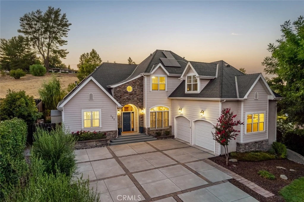 Impressive Westside beauty, just one mile from downtown Paso Robles! Perched on an elevated cul-de-sac in a beautifully landscaped one-third of an acre setting, this move-in ready, nearly 3,000 sf home delivers elegance and comfort at every turn. A cobblestone-accented driveway leads to a stunning interior with soaring ceilings, rich wood floors, oversized crown moldings, and Pella windows. The chef’s kitchen boasts a 48" commercial-style range, built-in refrigerator, matte leathered granite island, walk-in pantry, and abundant storage. The grand formal dining room sets the stage for memorable gatherings. The desirable floor plan includes a large main-level primary suite with a walk-in closet finished with built-in storage and a brand-new remodeled, spa-like bathroom. Upstairs offers two guest bedrooms, one ensuite, and a versatile media room or den (or fourth bedroom) with wet bar and generous hidden walk-through storage areas accessed by discreet doors. Outdoors, enjoy a sprawling covered patio outfitted with heaters, lighting, a ceiling fan, and breezy curtains—perfect for year-round entertaining. Beyond, you’ll find a fire pit, stone pathways, and an elevated view area ideal for evening sunsets, all surrounded by beautifully landscaped grounds with mature, drought-tolerant native plants. Equipped with solar panels and Tesla backup batteries, this home helps reduce monthly living costs while providing peace of mind with reliable backup power during an outage. Prime Westside location close to designer shops, upscale restaurants and bars, wine tasting, and the downtown park.