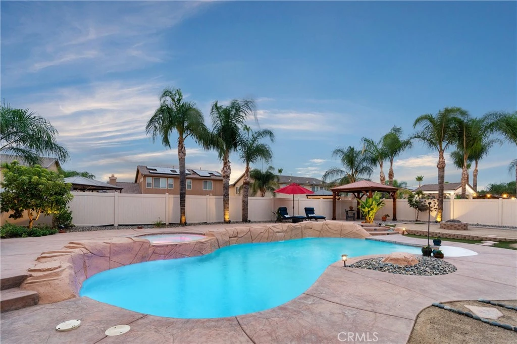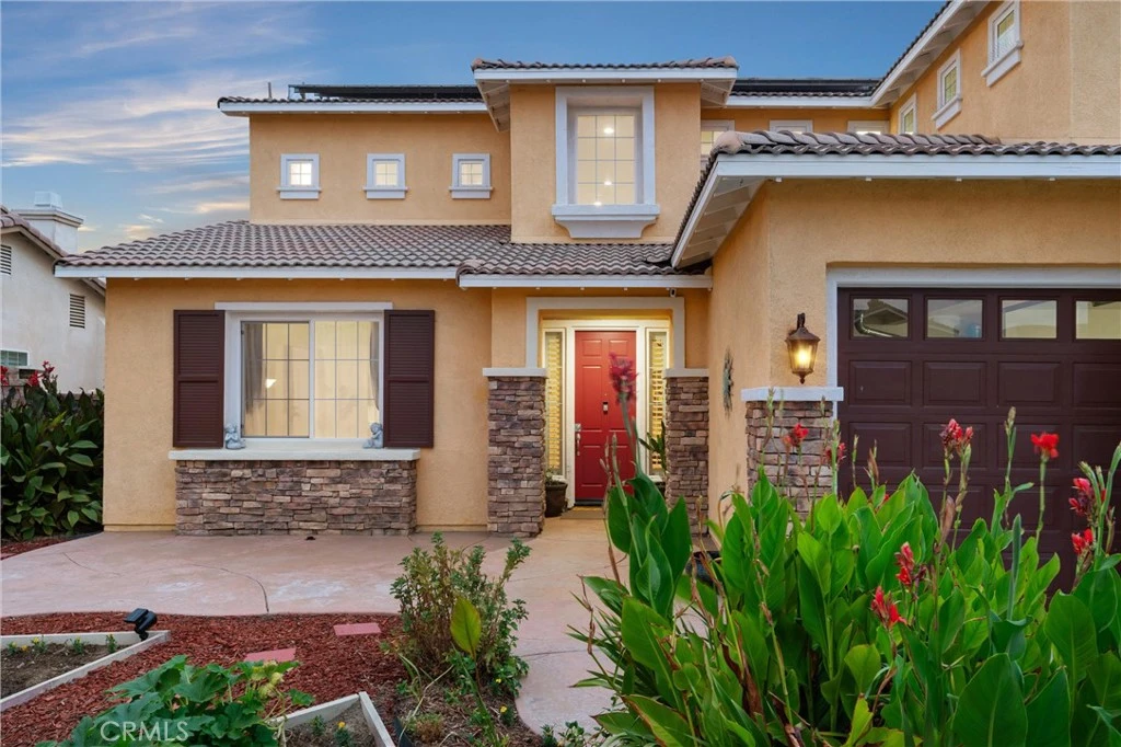 Welcome to 1448 Palermo Dr, a meticulously maintained 5 bedroom, 4.5 bathroom estate offering 4,173 sq ft of living space on a spacious 0.28 acre lot. Tucked into a small, secluded neighborhood just minutes from freeway access, this home delivers exceptional privacy, thoughtful design, and true resort style living. The backyard is an entertainer’s dream featuring a beach entry pool with three cascading waterfalls, a raised spa with tranquil water features, cabana, fire pit, zen garden, and expansive stamped and dyed concrete decking. Mature palms, productive fruit trees, and professionally designed edible and ornamental landscaping surround the home. Raised garden beds, water wise drip irrigation, and low maintenance concrete hardscaping complete this stunning outdoor retreat. Energy efficiency is a standout with 32 owned solar electric panels and 16 solar water heating panels providing near year round swimming comfort and long term utility savings. Additional upgrades include a durable concrete tile roof, dual AC units, and updated water heater. Inside, a grand foyer with soaring ceilings and dual staircases opens to expansive living spaces ideal for both everyday living and entertaining. The massive family room with fireplace flows seamlessly into the chef’s kitchen, dining area, and built in office space, creating an open yet cohesive layout. The kitchen features granite countertops, oversized center island with second sink, stainless steel appliances including double ovens, cooktop, dishwasher, microwave, walk through butler’s pantry, and a large walk in food pantry. The flexible floor plan is ideal for multi generational living with a downstairs bedroom and en-suite bathroom, adjacent bonus room, guest half bath, and ample storage. Upstairs features a spacious primary suite with fireplace, spa style bathroom, dual vanities, whirlpool tub, glass shower, and an oversized dual entry walk in closet. Additional bedrooms are thoughtfully arranged with a shared bathroom, a separate bedroom with a nearby private bath, a spacious bonus room, and a conveniently located upstairs laundry room with cabinetry and utility sink. A three car garage, exceptional storage throughout, and a prime Southern California location complete this remarkable home. Ideal for growing families, entertaining, and long term living.