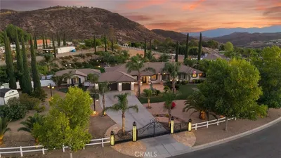 Experience unmatched privacy, sweeping panoramic views, and true resort-style living in the highly desirable Lake Mathews / Gavilan Hills region. Set on nearly 2.5 acres, this stunning estate features a beautifully upgraded main home, a full second dwelling, paid solar, and exceptional outdoor amenities — ideal for buyers seeking modern luxury, space, and a peaceful acreage setting with endless possibilities. The property is equestrian-friendly with direct access to nearby horse trails, making it perfect for those seeking land, riding capacity, and rural living without giving up convenience. The main home offers approximately 3,140 sq ft with 4 bedrooms plus an office, 3 bathrooms, a spacious 3-car garage, high ceilings, and an open floor plan with generously sized rooms. Interior upgrades include modern tile flooring, brand-new carpet, fresh interior paint, a fully renovated kitchen, and beautifully updated bathrooms. Step outside to your own private resort. The expansive backyard features a spectacular saltwater pool with a grotto slide, baja shelf/beach entry, two water features, and a spa, all designed to maximize relaxation, entertainment, and total seclusion. The property includes extensive parking and storage —including a 40x14 covered RV structure with 50-amp & 30-amp power, water, and an on-site sewer clean-out — ideal for RVs, toys, trailers, and off-road vehicles. A custom-timed LED lighting system illuminates a large portion of the grounds, creating a dramatic nighttime atmosphere and offering ready-made lighting for future additions such as a pickleball or basketball court, thanks to the court-ready LED system already installed. The spacious second dwelling/ADU adds incredible versatility, offering approximately 1,440 sq ft with 2 bedrooms, 2 bathrooms, and its own dedicated propane tank — ideal for multigenerational living, rental income, long-term guests, or private workspace needs. The main home has its own propane tank as well, creating added independence and utility flexibility. With usable land, equestrian capability, direct trail access, luxury upgrades, resort amenities, RV infrastructure, a full ADU, breathtaking views, and exceptional privacy, this estate delivers a rare combination of functionality, lifestyle, and high-end living in one of the most sought-after acreage communities in the region.