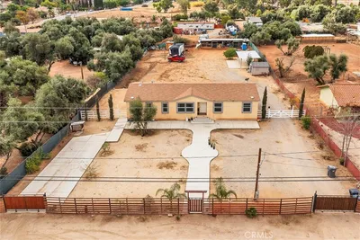 This rural property boasts panoramic views of the surrounding hills and local mountains. The 2.24-acre lot encompasses both sloped and flat terrain. The manufactured home features four bedrooms and two bathrooms with a total of 2,432 square feet of living space. Additionally, it is conveniently situated between the 15 Freeway and the 215 Freeway, accessible via Highway 74.