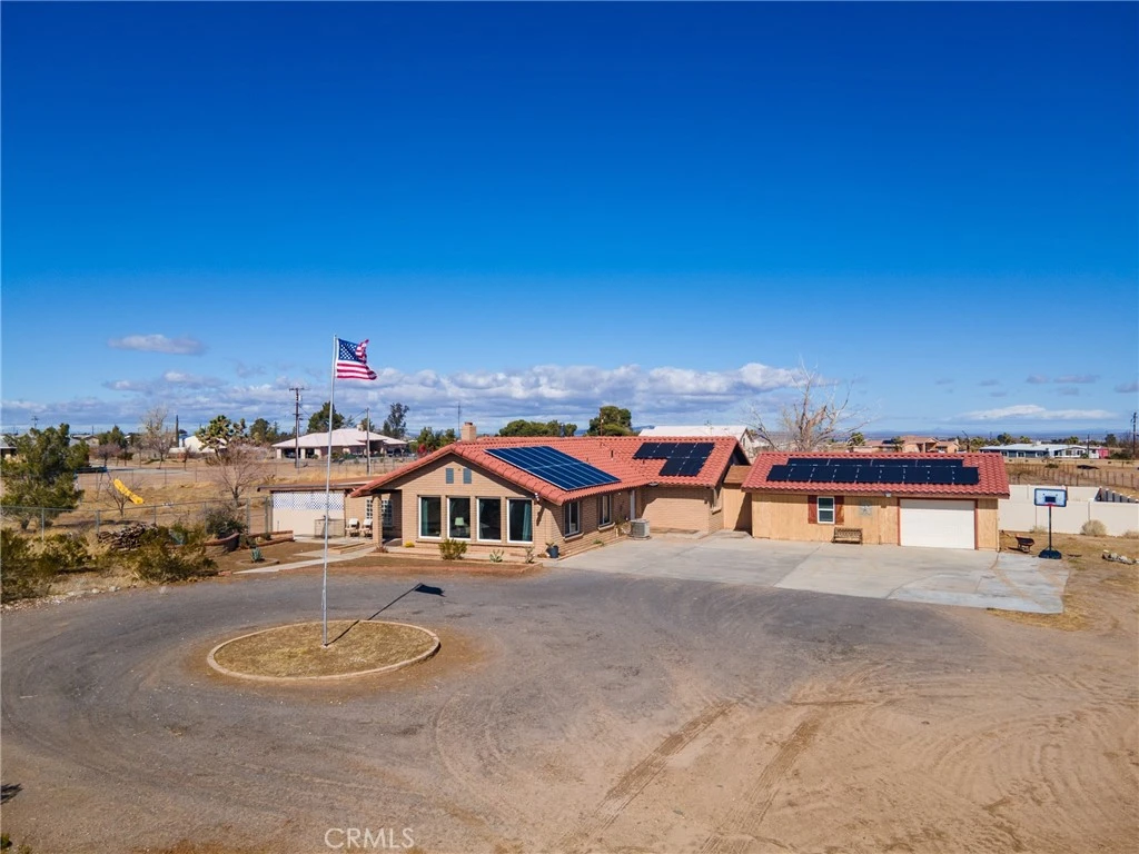 Custom brick home on a generous 2.5 acres that includes a salt system pool (save money on chemicals), RV parking w/full hookups and dump station, additional RV parking with power/water hookup. Ample space for parking, work equipment, play toys, horses or perhaps an ADU! Property is fenced w/an automatic gate at entrance & circular driveway. The main entrance opens to a bright & spacious living room with tons of natural light. Kitchen is open to family room with a wood burning stove/fireplace and wet bar. Designated dining area and laundry/mud room. Dual pane windows; walk-in pantry. Home has an enclosed patio/bonus room that leads to backyard w/a covered patio. Primary bedroom has spacious private bathroom w/large tub and separate shower. Two-thirds of the 3-car garage was converted to provide an additional two bedrooms providing a total of five bedrooms. Garage has been wired with an electric vehicle charging station. Generator transfer switch installed. Paid Solar panels to support an all electric home (no gas bills), close access to freeway, mountain views, many stars to see at night, and a peaceful neighborhood makes this home a 'must-see'.