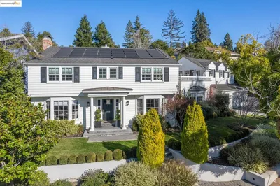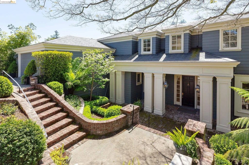 Tucked away on a picturesque cul-de-sac in a desirable center-of-town location, this remarkable residence sits on nearly 1/2 acre of park-like grounds offering stunning views, privacy, and a thoughtfully designed floorplan. Close to top rated schools and hidden behind Piedmont Park, this home was originally built in 1925 and extensively remodeled in 1994. If features high ceilings, grand spaces bathed in natural light, four bedrooms on one level, and a state-of-the-art chef’s kitchen with great room that will be enjoyed by your family and friends. Almost hidden from the street, the dramatic entry is bordered by two fountains leading to a private front patio. The front door opens to a welcoming foyer with a soaring center staircase. The public rooms flow onto a spacious terrace overlooking the extensive grounds, downtown Oakland and the San Francisco Bay, providing seamless indoor-outdoor flow. The kitchen is the heart of the home with its massive center island with counter seating for casual dining, a second food preparation station with one of two Miele dishwashers and professional appliances including 2 Thermador ovens flanking a 6-burner Wolf gas range with griddle. Whether you are on your way to the excellent schools, pickleball, an off-leash dog run, you are close to home. Views: Downtown