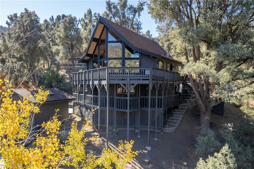 Set over three levels and crafted throughout with Western red cedar, the home features a spacious main floor with two bedrooms, a full bath, a well-appointed kitchen with breakfast bar, and a living room anchored by a wood-burning fireplace. Floor-to-ceiling windows open up sweeping 180-degree mountain views, creating a natural connection to the landscape. The upstairs loft functions as a third bedroom with its own seating area overlooking the living space below. Downstairs serves as a flexible bonus area—complete with a poker table, wood-burning stove, flat-screen TV, storage, and double doors that lead out to the deck. A detached second unit adds even more value, with a one-car garage on the lower level and a large workshop with laundry above. The home is equipped with central heating and a state-of-the-art Plant Oath Solar system with battery backup, included in the sale. This cutting-edge technology uses a conductive backsheet and integrated back-contact design to maximize performance and aesthetics—delivering $0 electricity bills without compromising style. Tucked into the Los Padres National Forest and located just half a mile from the village center and clubhouse, this one checks all the boxes for mountain living with elevated touches and real savings built in. Ownership in Pine Mountain Club includes membership in the Property Owners Association, with dues of $165 per month. This provides access to a variety of amenities: an Olympic-style pool and spa, tennis and pickleball courts, a nine-hole scenic golf course, an equestrian center, and more. The community also offers essential year-round services like 24/7 patrol, trash and recycling, road maintenance, and snow removal. For added peace of mind, Kern County Fire Station 58—equipped with paramedics and a helipad—is located right in the community to ensure fast emergency response when needed.