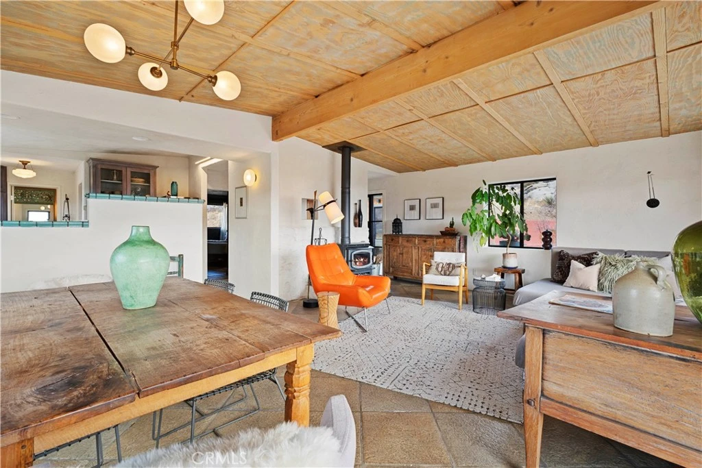 Set among massive boulders, native wildflowers, and old-growth Joshua Trees, this 5-acre property in Gamma Gulch feels like something you stumble upon once and never forget. Quiet, cinematic, and deeply peaceful, it’s the kind of place where the desert shows off—sunrises, long shadows, and sweeping views that stretch all the way to Joshua Tree National Park, and the snow-capped peaks of Mount San Jacinto. The main home is a thoughtfully updated 1-bedroom, 1-bath with just over 1,000 square feet, designed to frame the landscape from every room. Enter through custom iron doors by Pinky’s into a welcoming space that blends craftsmanship with comfort. The kitchen is a dream for anyone who loves to cook, featuring a Viking range and walk-in pantry. A wood-burning stove anchors the living room, creating a cozy place to unwind on cool desert evenings. The bathroom has been recently refreshed with modern fixtures, and the home has been newly painted throughout. Outside, the property continues to impress. A private garden with mature landscaping feels like a hidden oasis, while the patio is perfect for entertaining under the stars. Just off the main house is a studio currently used as a second bedroom, along with a finished two-car garage that offers excellent storage or creative space. At the opposite end of the land—completely private and visually separated—is a second, remodeled 700 square feet home. With an open-concept layout, full bathroom, and kitchenette, Ideal for guests, or a dedicated work-from-home retreat. The exterior has just been repainted, and the home feels fresh and serene. The main houses a private well, while the second home has its own 2,400-gallon water tank with a new digital pump. Both homes have been successful short-term rentals in the past (buyer to verify current permitting and usage), offering flexibility for personal use, income, or a combination of both. Furnishings may be negotiated with some exceptions. Despite its sense of seclusion, the property is easily accessible—just 7–8 minutes down a well-maintained dirt road, about 20 minutes to Yucca Valley, and only 15 minutes to the Pappy & Harriet’s. Adjacent 4.6-acre parcel is also available for separate purchase, offering even more room to expand or preserve the surrounding landscape. Private, expansive, and surrounded by unforgettable scenery, this Gamma Gulch retreat is a rare opportunity to own a true piece of the high desert—one that feels worlds away, yet perfectly connected.
