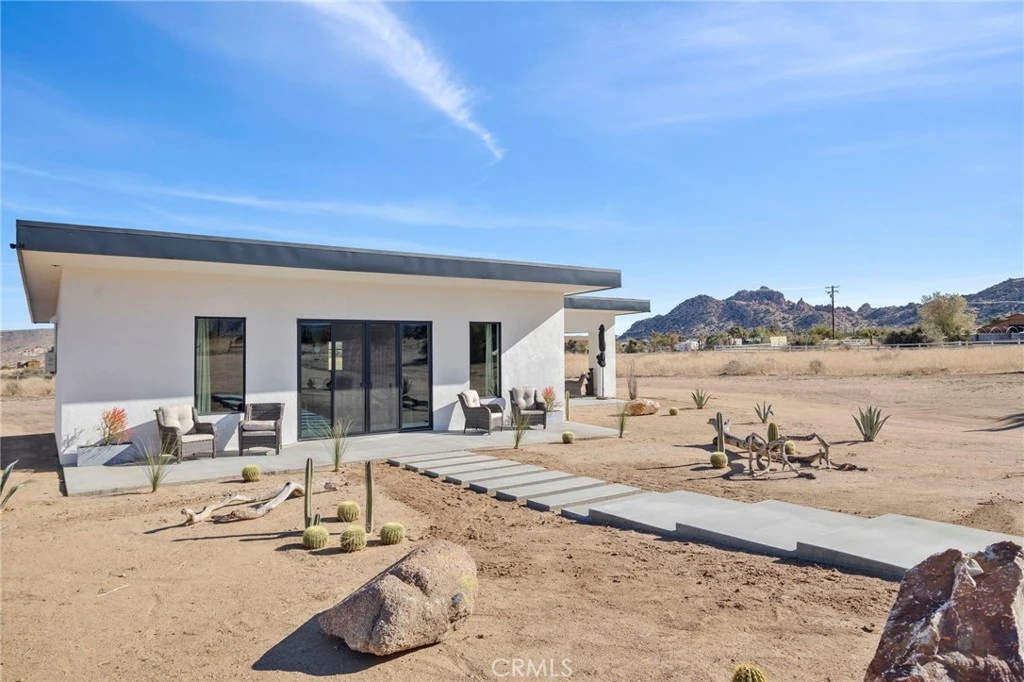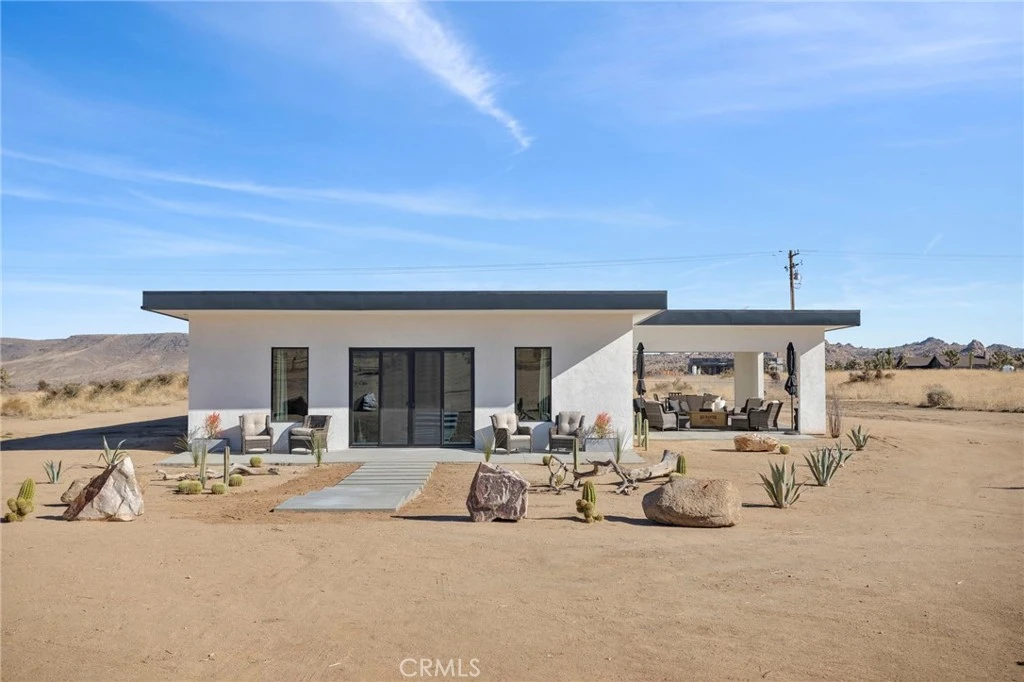 Welcome to Tom Mix Road, a striking architectural desert retreat located just minutes from Pioneertown and its iconic dining, entertainment, and High Desert attractions. Currently operating as a successful vacation rental, this thoughtfully designed property blends modern finishes with the dramatic beauty of the surrounding desert landscape and is being offered fully furnished, making it a turnkey opportunity for a continued short-term rental, second home, or personal retreat. Inside, the home features finished concrete flooring, soaring ceilings, and an expansive great room filled with natural light. The kitchen is both functional and stylish, highlighted by a large center island, upgraded cabinetry, slide-in five-burner stainless steel range, dishwasher, refrigerator, farmhouse sink, and a statement stainless and glass hood. The open dining area sits just off the island, creating a seamless layout ideal for entertaining. Large sliding glass doors frame stunning desert views, including nearby boulder formations and distant mountain vistas toward the backside of Big Bear in the San Bernardino Mountains. Outdoor living areas are designed to fully capture the surrounding landscape and include multiple patio spaces along with a private rear yard featuring a spa and hot tub—perfect for relaxing under the desert’s star-filled night skies. Additional upgrades include paid-off solar, a 400-amp electrical panel, full RV hookups, metered water service, and an EV charging station, p