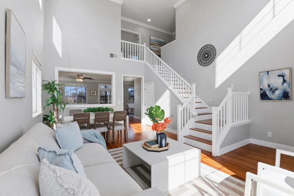 Welcome to 609 Rockspray Circle in Pittsburg, a well maintained two story home located in a desirable gated community. This residence offers 4 bedrooms, 2.5 bathrooms, and 2,135± SqFt of living space on a 4,200± SqFt lot with owned solar panels for added energy efficiency. Interior features include bamboo flooring, classic crown molding, recessed lighting, central HVAC, and d/p windows throughout. The living room showcases high ceilings, abundant natural light, recessed lighting, and a convenient coat closet. The open great room features a gas fireplace and modern pendant lighting, flowing into a stylish kitchen with quartz peninsula island, designer tile backsplash, white shaker cabinets, KitchenAid gas range and microwave, walk in pantry, and direct access to the backyard. A functional laundry mudroom includes patterned tile flooring, cabinetry, and an updated vanity with quartz countertop. The primary suite offers bamboo flooring, double door entry, ceiling fan, and abundant natural light. The primary bathroom features porcelain tile flooring, double vanity, soaking tub, glass enclosed walk in shower, and a private water closet. The backyard offers double covered patios, a stacked stone retaining wall, and mature fruit trees including peach, pear, and jujube.