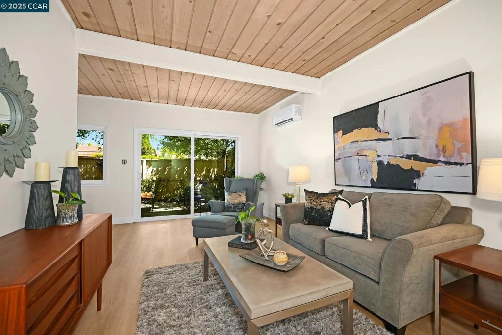 Beautiful Ground-Floor Condo in Prime Location! Modern 1-bed, 1-bath home with no neighbors above or below and no steps in! Features an open kitchen with new granite counters and stainless appliances flowing into dining space. Ceilings are natural wood with beams for a super cozy atmosphere. Enjoy recent upgrades including luxury vinyl flooring, fresh paint, new light fixtures, faucets, new mini-split HVAC unit, and updated bathroom. Spacious bedroom offers privacy at the rear of the unit. Private patio perfect for gardening, relaxation, plus covered carport parking and extra storage just outside your door. Windows, slider are double paned. Community amenities include sparkling in-ground pool and shared card-operated laundry. Ideally situated on the Walnut Creek/Lafayette border within walking distance to Palos Verdes Mall. Just 8 minutes to multiple downtown areas with easy highway 24 and 680 and BART access.