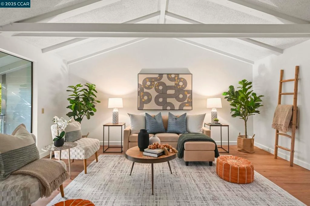 Move right in to this delightful, recently refreshed townhome is Pleasant Hill's sought after Golf Ridge subdivision. This bright, cheerful townhome offers the perfect blend of comfort and convenience. Soaring vaulted, beamed ceiling and striking stone fireplace create a warm welcome in the open concept living area, while the slider leads to a shady patio—perfect for relaxing or an evening BBQs. The light-filled kitchen features white cabinetry, solid-surface countertops, and an effortless flow to the dining area for easy entertaining. The spacious primary includes an ensuite and a private balcony—perfect for morning coffee. The secondary bedroom is bright and well-appointed with a refreshed hall bath. Detached two-car garage, abundant storage and indoor laundry! Enjoy the community pool. HOA dues are on the lower side. Great location near highly-rated Mt. Diablo schools including Valhalla Elementary, Paso Nogal Dog Park, hiking trails, shopping, transportation, parks, and the best of the East Bay.