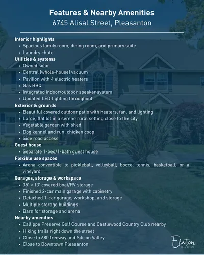 Experience refined luxury in this single-story Mediterranean home within the exclusive Reserve at Pleasanton. Poised on a quiet cul-de-sac, the residence overlooks protected HOA vineyards with sweeping foothill vistas. The expansive floor plan features 4BR/3.5BA plus an office, complemented by a fully-equipped private-entry 1BR/1BA ADU ideal for guests, multi-generational living, or rental income. Flowing interiors boast elegant finishes & abundant storage. The gourmet kitchen features custom cabinetry, stone surfaces & premium stainless steel appliances, opening to the family room & a resort-style backyard. Designed for entertaining, the outdoor oasis features a BBQ island, stone fireplace, pergolas, hot tub & integrated sound. The oversized spa-inspired primary suite includes a marble dual vanity, soaking tub, frameless glass shower & large walk-in closet. Future-ready amenities include two finished 2-car garages, overprovisioned Tesla solar with battery backup & dual EV chargers. Highlights include Andersen doors, Kohler fixtures, plantation shutters, new paint & carpet, water softener, multi-zone HVAC, & built-in fire sprinkler & security systems. Located near top-rated schools, downtown & wineries, this home offers an effortless wine country lifestyle in a premier enclave.