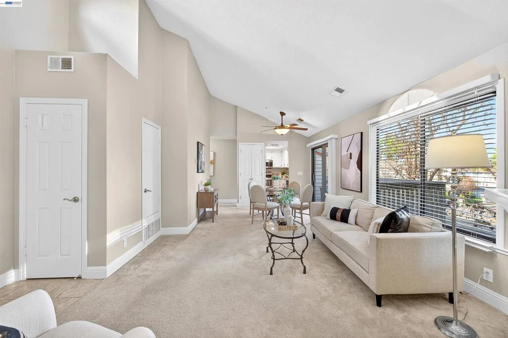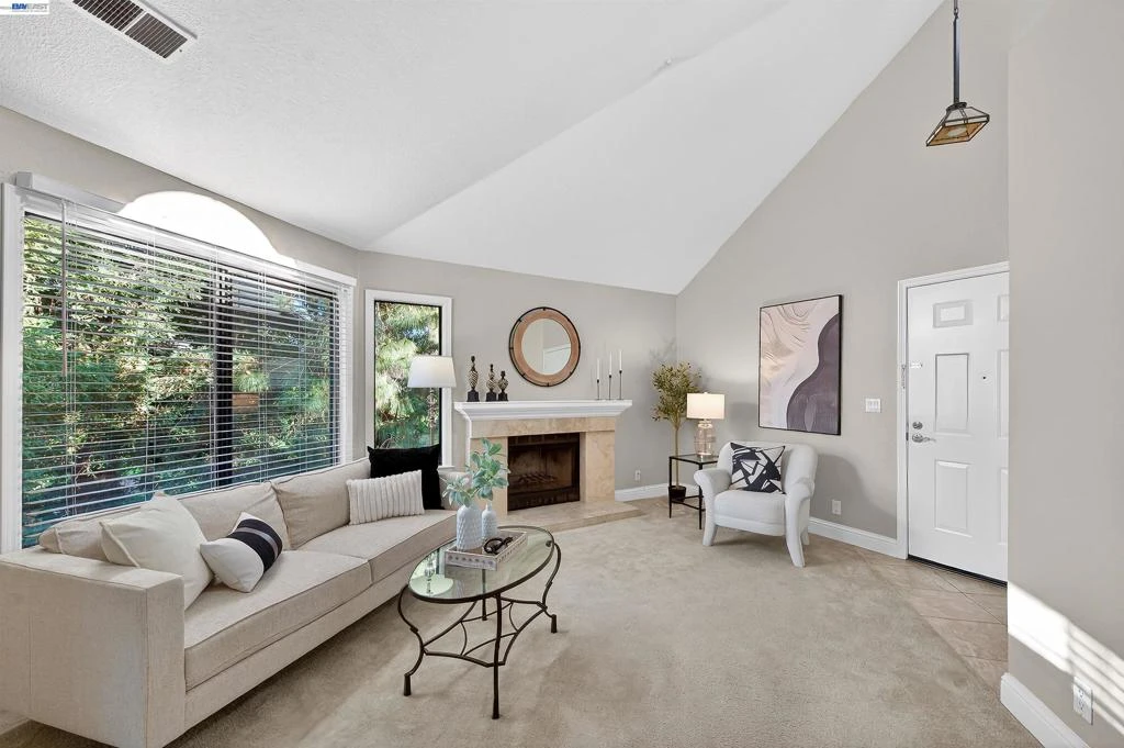 Stunning executive 2 bedroom, 2 full bath condo in Pleasanton offering vaulted ceilings and beautiful views. The light-filled living room features a stone fireplace with wood mantel and flows seamlessly into the dining area with overhead fan and sliding glass door to a large balcony overlooking the HOA pool, mature trees, and Tawny Park. The kitchen includes hardwood floors, granite countertops, stainless steel appliances including an electric range, microwave, refrigerator, and dishwasher, along with ample cabinetry for storage. The primary suite offers an ensuite bath with custom cabinetry and a floor-to-ceiling walk-in shower with seating. A second bedroom and hall bath with granite counters and shower over tub provide flexible living space. Additional features include a stacked washer and dryer in a laundry closet, detached one-car garage, and an assigned outdoor parking space, with abundant guest parking throughout the complex. Ideally located within walking distance to parks and Vintage Shopping Center, and just minutes to top-rated schools, historic Downtown Pleasanton, dining, and easy freeway access. Broker's Tour Fri, Mar 06, 10-1p | Open Houses Sat & Sun, Mar 07-08, 1-4p.