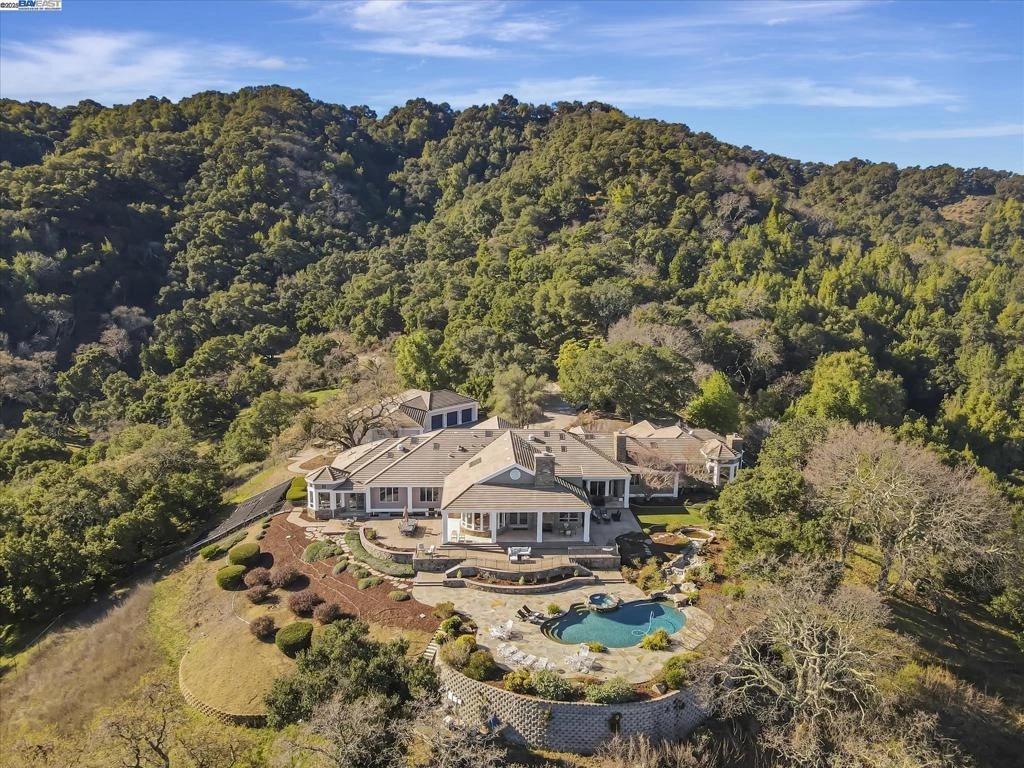 Nestled in the scenic Pleasanton Ridge, this 77.48-acre estate offers unmatched luxury and privacy. Built in 2000, the custom home spans 8,590 square feet with a single-level layout featuring seven bedrooms, six full baths, and two half baths. The gourmet kitchen is equipped with high-end appliances, stone countertops, and a breakfast bar, ideal for both everyday meals and entertaining. The adjacent family room boasts a cozy gas fireplace and large windows framing stunning views of Mt. Diablo and the valley. The expansive primary suite includes a spa-like bathroom with a jetted tub, stall shower, and skylight, plus a private retreat for quiet moments or a home office. A laundry room completes the main level. A highlight of this estate is the 10-car, museum-quality garage with heating, air conditioning, checkered flooring, and central vacuum. With 4 additional car garages provide extra storage and convenience. Outside, the landscaped grounds feature a swimming pool, a spacious deck, and a patio perfect for alfresco dining, all with panoramic views of the valley. This exceptional estate offers the ultimate in luxury, comfort, and natural beauty. Located in a top-rated school district, it provides excellent education for your children while offering a serene, outdoor lifestyle.