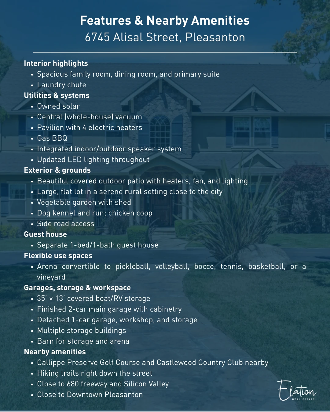 Experience the perfect blend of luxury living and country charm close to Downtown Pleasanton and adjacent to the prestigious Callippe Preserve Golf Course. This exceptional estate showcases a beautifully updated main residence, detached guest house, 13x35 covered RV storage, and multiple outbuildings with plenty of storage. Designed for entertaining and everyday living, the main home features a gourmet kitchen with professional appliances, large island, custom cabinetry, spacious pantry, and a wine room with wrought-iron detail. The inviting family room centers around a grand fireplace, while the expansive primary suite offers a private lounge, spa-like bath, and generous walk-in closet. Step outside to your private resort with a sparkling pool, heated pergola, and outdoor kitchen. Additional amenities include a 2-stall barn, riding arena, multiple garages, workshop, storage and so much room to expand the house or add additional structures. The charming guest house provides comfort and privacy. The zoning allows for either two horses or two large animals, if you choose. Enjoy amazing sunsets from this beautiful oasis.