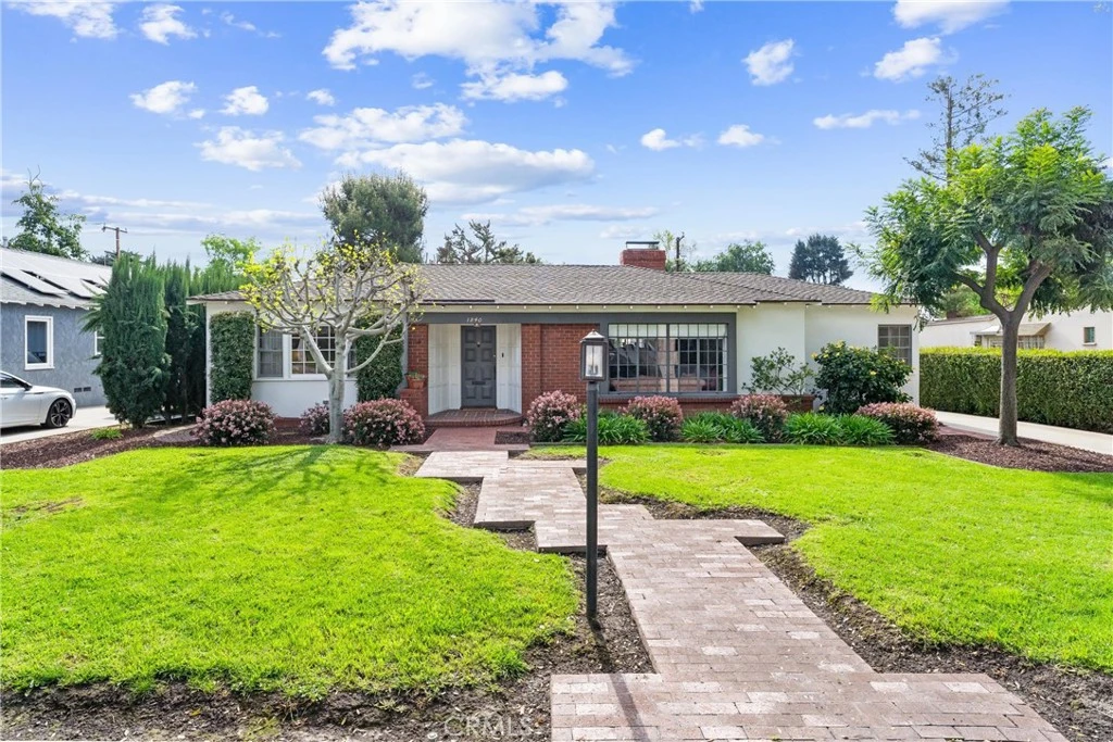 This beautiful single-story estate home in Pomona's highly sought-after Yorba district offers a blend of classic charm and modern amenities. Upon entering the home, you're welcomed by a formal entryway that exudes sophistication, with silk wallpaper, luxurious marble tile flooring and a stunning crystal chandelier. To the left, you’ll find the owner’s wing, where the expansive primary suite awaits. This spacious retreat offers three closets, ample natural light through a large window and cozy carpeting. The generous primary bathroom features a separate bathtub and vintage tile, maintaining its timeless elegance. On the right side of the entry is the large living room, highlighted by original hardwood floors, a magnificent bay window and a fireplace with a custom wood mantle and marble accent. Adjacent to the living room is the formal dining room, complete with rich red walls, white wainscoting, hardwood floors and a brass chandelier that adds to the room’s charm. The kitchen, located behind the dining room, is spacious and functional, featuring tiled surfaces and a convenient pass-through that opens to the family room. Beyond the kitchen lies the laundry room and a private bedroom with an en suite bathroom, perfect for guests or in-laws. The family room is a true highlight of the home, featuring a massive skylight that floods the room with natural light, a brick fireplace that stretches along one wall and custom shelving. It also boasts a built-in bar for entertaining and opens up to a wood deck that leads to a beautifully landscaped backyard, perfect for relaxing or hosting guests. Toward the back right of the family room, you’ll find three large bedrooms, each offering plenty of space and natural light. A built-in linen/storage closet runs the length of the hallway, while the full bathroom features dual sinks and a separate vanity for added convenience. The property is meticulously landscaped both in the front and back yards, providing a serene and private setting. The home also includes a two-car garage with an additional storage room at the back, as well as a separate shed. Situated on a picturesque, tree-lined street, this home is ideally located close to prestigious private schools, major freeways and a variety of amenities, making it an exceptional choice for anyone seeking comfort and convenience in a prime location!