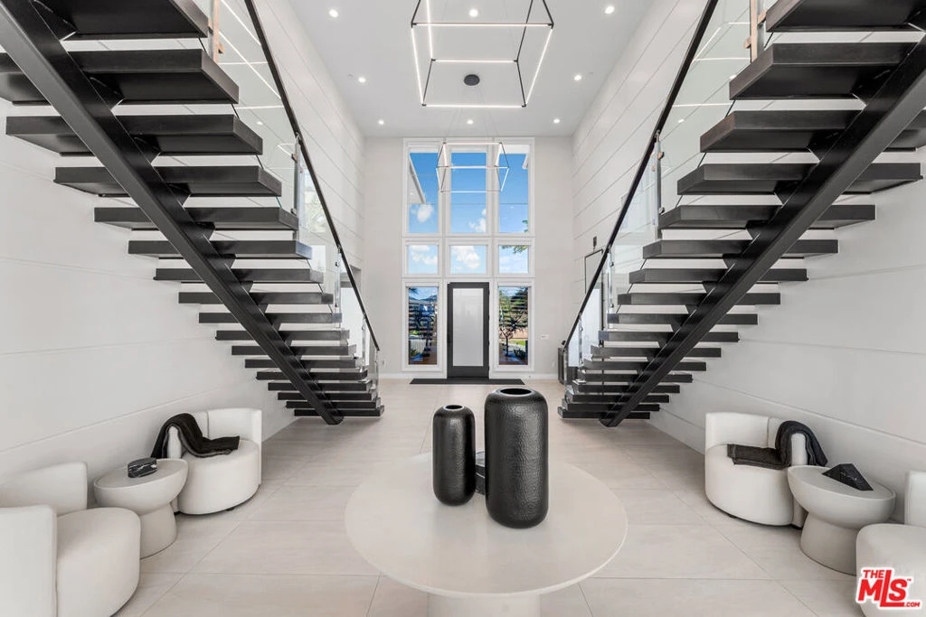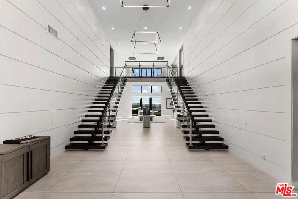 Exceptional gated Westcliffe one-of-a-kind estate offering privacy, luxury, and sweeping panoramic views of the entire San Fernando Valley. Ideally located at the end of a cul-de-sac on a 13,000 sq. ft. lot, this personal gated residence blends modern elegance with resort-style living. This two-story home features 5 bedrooms + loft and 5.5 bathrooms, including a versatile main-level suite with kitchenette. A dramatic entry showcases architectural wall paneling and a dual floating staircase. Interior highlights include European oak flooring, premium tile finishes, Phillip Jeffries wallpaper, in-ceiling speakers, and Hunter Douglas motorized window coverings throughout. The chef's kitchen is equipped with Sub-Zero and Wolf appliances, including a wine refrigerator. The expansive primary suite offers stunning valley views and a custom California Closets walk-in with integrated LED lighting and dual islands. An upstairs den provides a private movie room with projector and 120" screen. Resort-style backyard features include a saltwater pool with Baja shelf and spa, waterfalls, fire feature, two floating pergolas, outdoor TVs, and over 15 speakers. The outdoor kitchen includes a Lynx BBQ suite with premium appliances for elevated entertaining. Additional amenities include a two-car garage with sleek epoxy flooring, a converted third-car garage currently used as a luxury in-home performance gym, and an extended private driveway offering parking for up to six vehicles. Lush landscaping, commercial-grade palms, and 22-foot privacy hedges complete this private luxury retreat. A rare opportunity in one of Porter Ranch's most coveted gated communities.