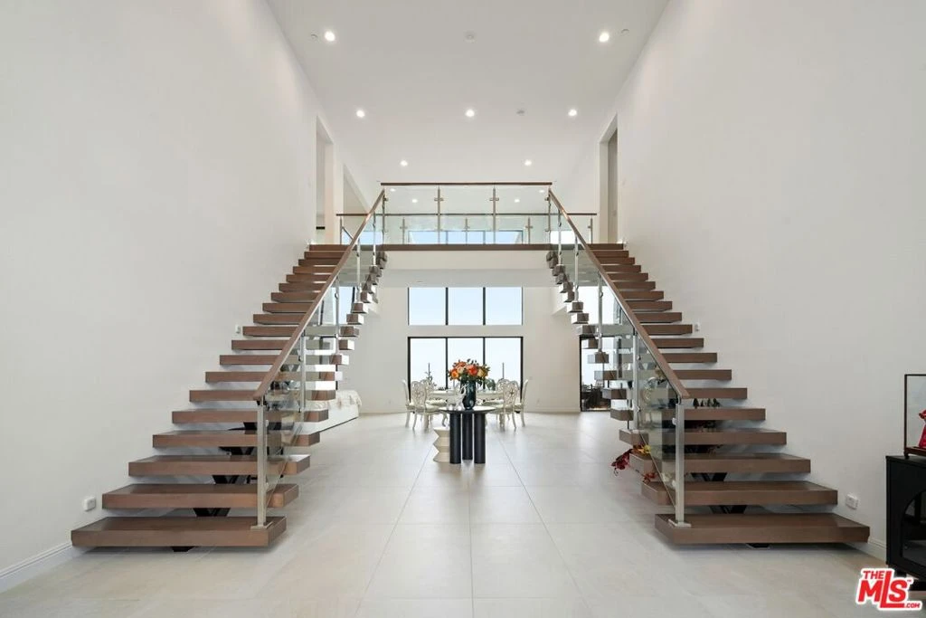 Welcome to this truly magnificent estate, nestled in the prestigious, guard-gated Westcliffe community of Porter Ranch. Showcasing the highly sought-after Pacific floor plan from the elite Skyline Collection, this 5,567 sq ft residence offers an exceptional blend of modern luxury, timeless design, and functionality. The home features 5 spacious bedrooms, 5.5 elegantly appointed bathrooms, a large upstairs loft oversized balcony, dual garages, and a highly desirable private Gen Suite on the main level, ideal for multigenerational living or guest accommodations, includes private access to exterior. From the moment you step through the oversized front door, you're welcomed by grand dual floating staircases and a striking double-height foyer. The expansive great room is flooded with natural light from floor-to-ceiling windows and seamlessly connects to the outdoors, making it perfect for both relaxing and entertaining. At the heart of the home is a true chef's dream: a gourmet kitchen with custom marble countertops and backsplash, premium Sub-Zero and Wolf appliances, a large eat-in center island and gorgeous tile floors throughout. As an added bonus, the home also includes a fully equipped prep kitchen, offering a second space for cooking, hosting, or catering an entertainer's dream. Upstairs, the luxurious primary suite features a private retreat, a massive custom walk-in closet, and a spa-inspired en-suite bathroom with high-end finishes. Situated on an oversized flat lot with a sprawling wraparound backyard, the home offers breathtaking city and mountain views and a rare oversized driveway. Additional highlights include solar panels and expansive glass sliders for seamless indoor-outdoor living. Located just minutes from top-rated schools, the 118 freeway, and the highly acclaimed Vineyards shopping center home to Whole Foods, Nordstrom Rack, AMC Luxury Cinemas, fine dining, and morethis estate delivers the pinnacle of upscale Southern California living.