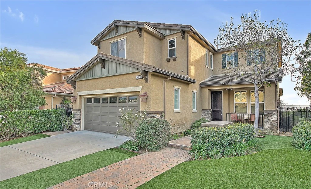 Exquisite two-level Contemporary Mediterranean home located in the 24-hour guard-gated Meadows community of Porter Ranch. The main level features a formal dining room near the entry and a spacious, inviting living room with a fireplace, custom built-in TV cabinetry, and recessed lighting throughout. The open gourmet kitchen, just off the living area, offers custom cabinetry, ample counter space, and stainless-steel appliances, complemented by real hardwood flooring throughout the kitchen and living spaces. A large sliding glass door opens to the backyard, creating seamless indoor and outdoor living. The backyard is well-suited for both entertaining and relaxation, featuring a wood-framed patio, built-in BBQ, and scenic mountain views. Upstairs showcases hardwood stairs and flooring throughout, three bedrooms, two full bathrooms, and a bright, open loft ideal for a home office, play area, or additional living space. The expansive primary suite offers a spa-inspired bathroom with a jacuzzi tub, walk-in closet, and multiple functional vanity areas. Additional highlights include vinyl double-pane windows and a three-car attached garage. Conveniently located near Cal State Northridge, Porter Ranch Community School, The Vineyards shopping center, restaurants, AMC movie theater, and grocery stores, this home offers a well-balanced blend of comfort, style, and convenience.