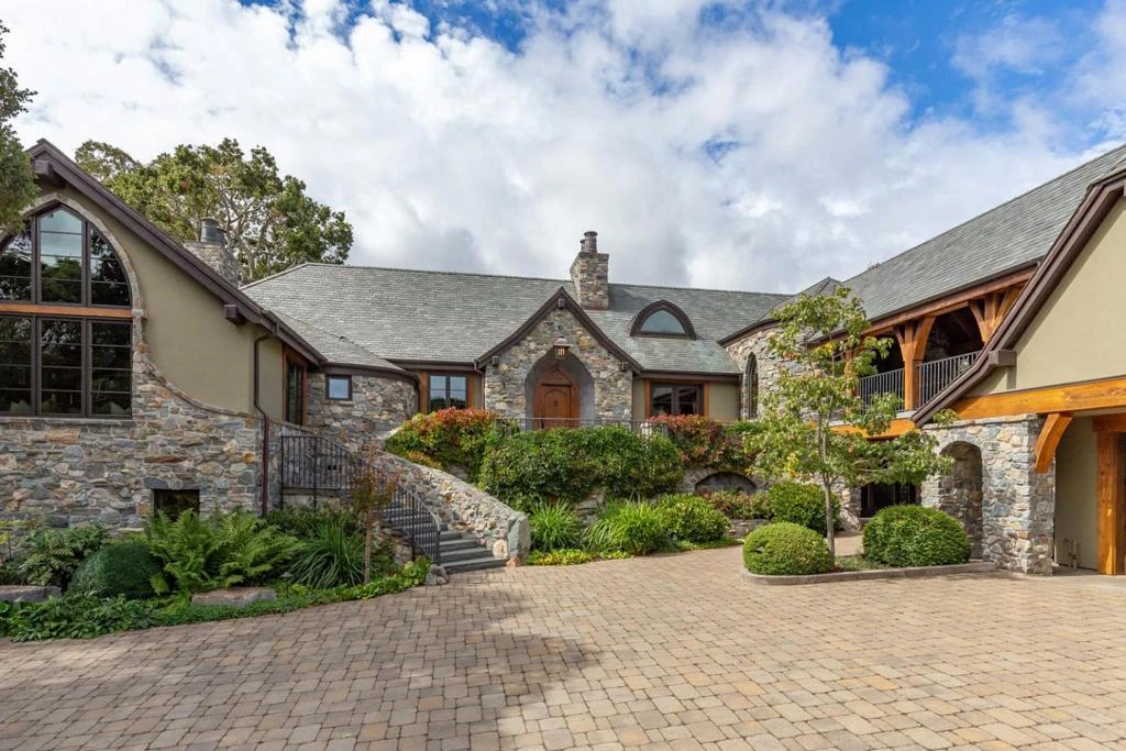 Set on two acres of picturesque rolling hills dotted with California oaks, this country manor is architecturally designed to evoke the beauty & appeal of a French country estate. Inside & out, the home embodies elegance & charm with rustic sophistication. The exterior is a harmonious blend of natural stone & stucco siding, complemented by a high-pitched Vermont slate roof. Large arched windows & handcrafted oak timber doors enhance the sense of history & authenticity. The design features a masterfully constructed covered bridge, made from reclaimed barn wood & bluestone flooring, connecting the round turret of the main home to the upper-level guest quarters above one of two garages. Handcrafted wrought iron railings, skillfully forged by a blacksmith, adorn the bridge, the front porch, & stairways from the motor court, adding artistic detail at every corner. Home exudes rustic grandeur with lofty ceilings constructed from hand-hewn century-old beam timbers. Located just minutes from the heart of Silicon Valley, this country manor harmoniously blends architectural splendor, natural beauty, & modern conveniences. It stands as a testament to refined living, where the allure of the past meets the dynamism of the present, creating a sanctuary that is both timeless and contemporary.