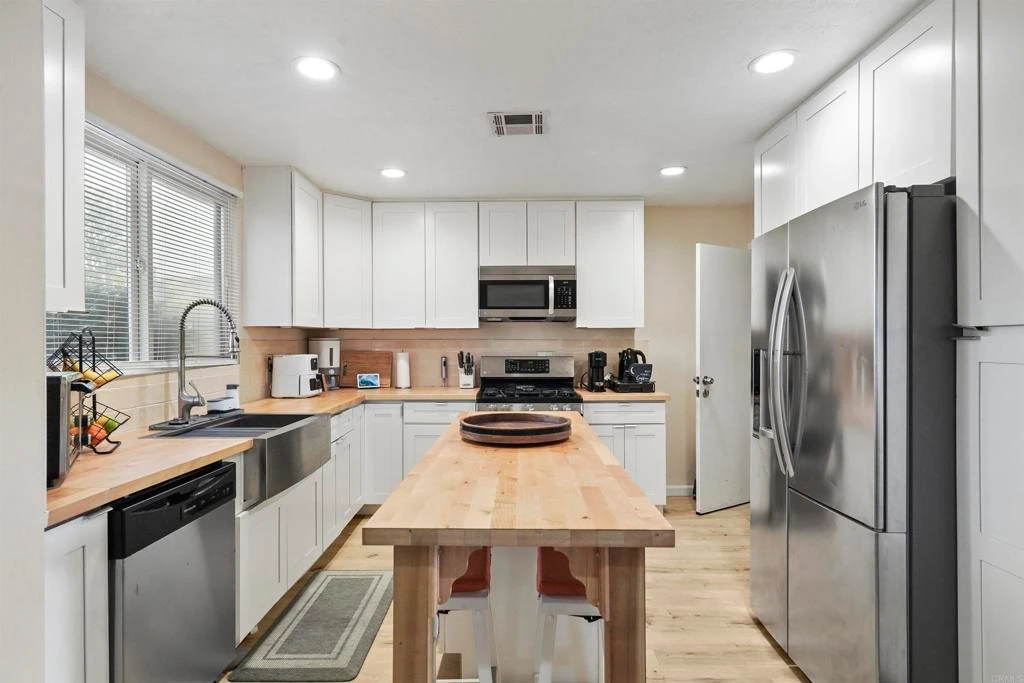 Exceptional value for this charmingly updated & turn-key starter home with a pool on a large lot! Send your kids to high-ranked Poway Schools. The open kitchen has been updated with newer cabinets, block wood counters, an island and stainless steel appliances. Both bathrooms are updated and include granite counters, new lighting and custom tile work that match the tile floors throughout. A cozy fireplace welcomes you to the living room and wood box beam ceilings give an added touch of classic design.The home has a newer roof & recessed lighting throughout as well as a level 2 EV charger for your electric car. Enjoy the simplicity of low maintenance landscaping and save on water bills, too. Enjoy mountain views & summer BBQs by the pool in this oversized backyard with room to grow/make it your own. Hurry this home will go fast!