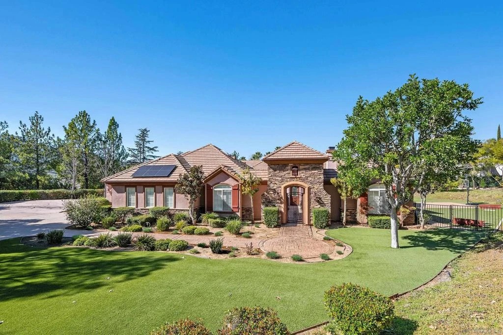 Executive, single-story home situated on an 1 acre lot, complete with saltwater pool/spa, putting green, and 46 panel / 15.2 kW owned solar system AND pool solar, this large corner lot is located in the desirable neighborhood of Huntington Gate in Poway. Five bedrooms are ensuites, the 6th bedroom was walled off from the expansive front living area and features a full-sized bathroom adjacent to the bedroom. The gated courtyard with fireplace, fountain, and multiple seating areas give this stately home a top of the line feel. Soaring ceilings (10 ft+) throughout the home, spacious gourmet kitchen w/ Viking Appliances, double ovens, butler's pantry w/ wine fridge, & large island w/ breakfast bar that opens to a large great room w/ views overlooking the pool and greenery. The expansive backyard, mostly designed with turf, is an entertainer’s paradise with pool/raised spa, putting green, private BBQ area, and Alumiwood covered patio. This home is complete with TWO separate 2-car garages (4 car garage total) and room for plenty of additional parking. There are beautiful custom kitchen cabinets and an abundance of large windows to let in the natural sunlight throughout the main rooms. There are multiple French doors that open to the backyard and front courtyard, along with beautiful archways throughout the home. The primary suite opens to an adjoining sitting area with breathtaking views of the pool/spa and firepit. Primary bathroom as dual vanities and abundant walk in closet. Don't miss your opportunity to own this custom, spectacular home!
