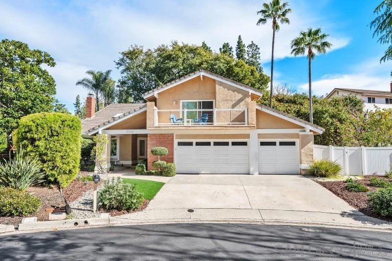 Welcome to this charming home located on a quiet Cul-de-Sac, in the highly desirable Vineland Hills in North Poway. The living area seamlessly blends elegance and functionality, the living room is flooded with natural light from skylights and has cathedral ceilings and a cozy fireplace. Celebrate special occasions in the formal dining area or unwind in the family room, complete with a wet bar, the perfect haven for casual get-togethers. No expense was spared in the stunning kitchen boasting KitchenAid and Bosch stainless steel appliances, granite counters, soft-close custom cabinets, and a granite sink creating a space that is both functional and aesthetically pleasing. Enjoy casual meals at the breakfast bar, illuminated by chic pendant lighting. Upstairs, the primary bedroom includes a spacious newly updated balcony. The remodeled en-suite bathroom boasts custom cabinets with double vanities, a frameless glass shower, and a seating bench. The three secondary bedrooms share a remodeled bathroom. Throughout the home, you'll find stylish and functional features like dual-pane windows, plantation shutters, ceiling fans, skylights, and a Trex Pergola. There's a laundry and mudroom combo complete with a shower and a laundry chute from the upstairs bathroom. The Vineland Hills community offers a swimming pool, walking trails, tennis and pickleball courts, and a children's playground, and is within walking distance of Chaparral Elementary School and Valle Verde Park.