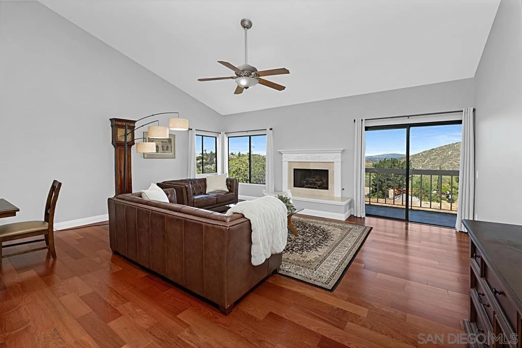 Best value in Stoneridge Chateaus with one of the largest floor plans (1,624 sq ft) and beautiful mountain and greenbelt views. This light-filled upper-level second story single-story home features vaulted ceilings and a private balcony that captures the open, tranquil setting rarely found in condo living. The spacious layout offers 2 bedrooms, 2 bathrooms, and a versatile bonus room ideal for an office, den, guest room, or potential third bedroom. The living room includes a cozy fireplace and large windows that enhance the open, airy feel. Real cherry wood flooring runs throughout the main living areas and bedrooms. The updated kitchen offers modern finishes, a functional layout, bright breakfast area, and generous cabinet space, including in-unit washer and dryer. The home is move-in ready. The primary suite enjoys scenic views and ample closet space, while the secondary bedroom provides privacy. Additional highlights include an oversized detached garage and ample guest parking. The HOA covers water, trash, exterior maintenance, roof, landscaping, and master insurance. Located in a quiet North Poway community where residents enjoy walking trails, open space, and pools, and close to Lake Poway, Bernardo Winery, shopping, dining, and Poway Unified schools.