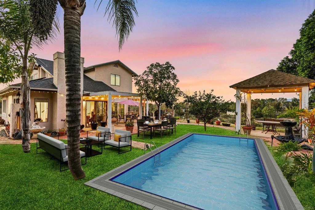 Situated on 4.86 ACRES, with an impressive Contemporary Ranch-Style Home. The property is situated on the West End with fabulous panoramic mountain views of Ramona just off Mt. Woodson. The large Master Suite includes a six-jet spa tub, a walk-in closet and improved marble bathroom with an oversized walk in shower, and French doors leading to the outdoor wrap around deck to enjoy the spectacular Views. Enjoy the Mature apricot, pomegranate, two lemon, bay leaf and a handful of lavender, citronella trees throughout the property. The kitchen includes a newer GE Monogram convection double oven. Recessed lighting throughout, and the majority of windows have been upgraded. Enjoy two fireplaces in both the formal living room and family room, all while hosting your guests with an open kitchen concept. Included are six sliding doors to enjoy the breathtaking views with an abundant amount of natural lighting throughout the home. There is a serene and breathtaking sunrise and sunset view just right off the outside deck with a Koi pond. There is much more potential for development and an expansive amount of usable land to include, whether your looking to build several ADUs, Casitas, or your very own customized pool oasis and as a forever multi-generational opportunity! (pool/outdoor Rendering photos attached in listing).
