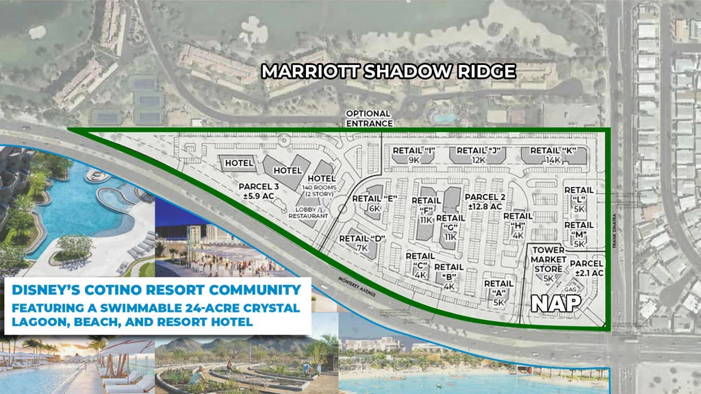Across from Cotino, a Disney Storyliving luxury mixed use community development with homes, hotel, shopping, dining, entertainment and a 24-acre Crystal Lagoon. Adjacent to Marriott Shadow Ridge Golf Resort with 424 units plus 93 recently approved single family homes. Infill Commercial Development Site in the heart of the Coachella Valley adjacent to Marriott Shadow Ridge Golf Resort. Exposure with nearly 1/2 mile of frontage on Monterey, one of the most traveled thoroughfares in the Coachella Valley. Located near Sunnylands, the renowned Presidential Retreat and Cultural Center, and Mission Hills Country Club, home of the Dinah Shore LPGA Golf Tournament. *Brochures can be downloadable in the 'Document' tab.