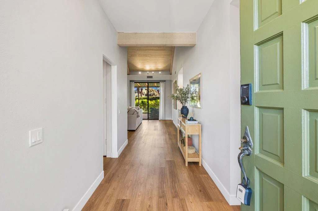 Completely redesigned by a leading Los Angeles design team, this 2-bedroom residence in Mission Hills Country Club offers a level of finish and detail that sets it apart. Warm finishes and a strong indoor-outdoor connection define the space. The living room features vaulted wood-beamed ceilings, a tiled fireplace, and a custom built-in wet bar. Large sliders open to a covered patio just steps from the community pool and spa, creating a setting that lives like a private extension of the home. The kitchen pairs clean design with quality materials, including white oak soft-close cabinetry, brass hardware, quartz countertops, stainless steel appliances, and an island suited for dining and entertaining. The dining area opens to a front patio with mountain views. The primary suite includes direct access to the back patio and a redesigned bathroom with floor-to-ceiling textured tile, dual vanities, and a walk-in shower. A reconfigured layout adds a bonus area off the suite, suitable for a sitting space, office, or reading nook. The guest bedroom also opens to the patio and is served by an updated hall bath with a soaking tub, glazed ceramic tile, and terrazzo-inspired flooring. Additional features include dimmable lighting, a laundry closet, ample storage, and a private two-car garage with dedicated golf cart space. The HOA covers Spectrum cable and internet, landscaping, trash, community pools, and roof and stucco maintenance. The land lease extends through 2121. A membership at Mission Hills Country Club offers access to three golf courses, tennis and pickleball courts, croquet lawns, fitness facilities, and multiple dining venues. Located minutes from shopping, dining, and hiking, with close proximity to El Paseo, downtown Palm Springs, and The Palm Springs International Airport. Don't miss out on this opportunity to make this property yours.