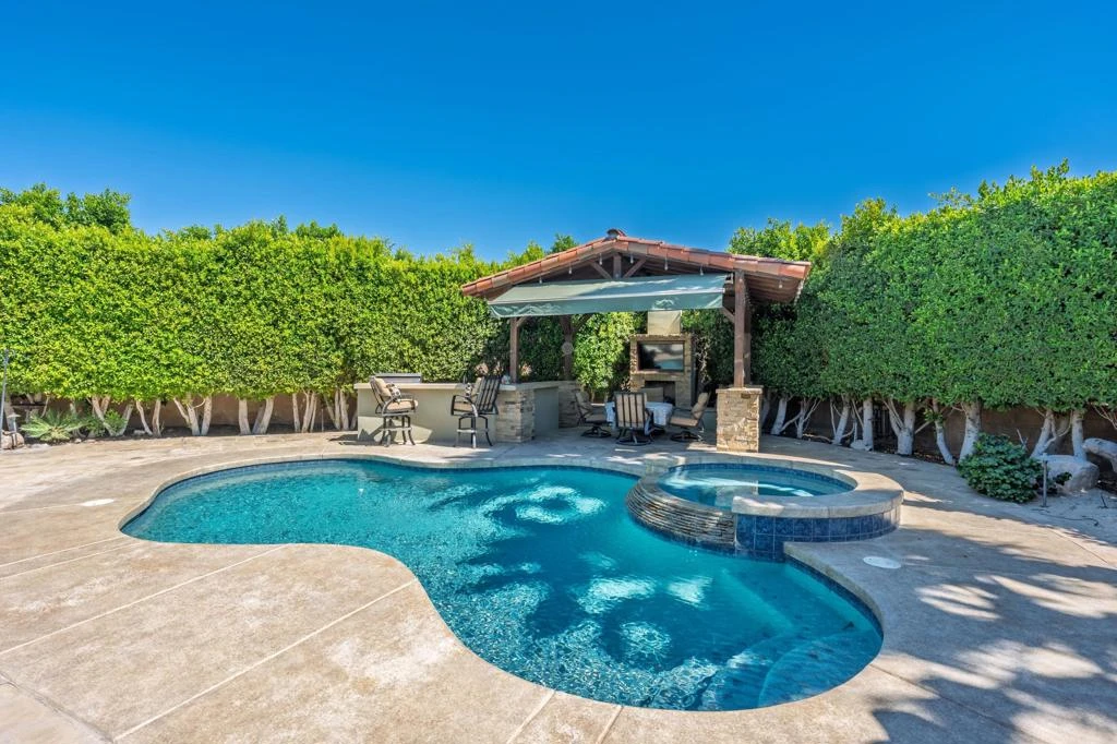 Located in the intimate gated enclave of Cielo-comprised of just 15 custom homes in the heart of Rancho Mirage-sits this stunning property on a private 15,000 sq. ft. lot. This 4-bedroom, 4-bath home offers over 3,600 sq. ft. of grand living space, including a completely detached, spacious casita with an en-suite bath and fireplace. This property has recently benefited from over $130,000 of upgrades. Enjoy numerous custom features and updates, such as soaring ceilings throughout, solid-core doors, dual pane windows, newer HVAC systems and ductwork, newer pool equipment and pool/spa resurfacing, hardwood floors, and recently painted interior and exterior of home, along with awnings and solar. Step into the gourmet kitchen, featuring granite slab countertops, a center island, stainless steel appliances, a separate bar area, ample cabinet space and a butler's pantry. Relax in the generously sized primary suite complete with a large walk-in-closet, spa-like bath, a deep soaking tub and walk-in shower. Outdoors is an entertainers dream with a spectacular backyard showcasing a sparkling pool and spa, fire pit, putting green, beautiful landscaping, a cabana with a TV, heater, lighting, and ceiling fan, as well as a built-in BBQ, outdoor kitchen, and a bar. Multiple covered patio spaces offer a misting system and awnings. Enjoy an outdoor, air-conditioned bonus room perfect for an office or hobby space. Other features include a decorative fireplace in the living room, exposed beam ceilings, water purification system, ceiling fans, separate laundry room with sink and a well-sized 3 car garage with storage. This unique community is very close to all conveniences such as shopping, restaurants, and a movie theatre, and just minutes away from Eisenhower hospital. HOA dues are low-making this a truly special offering!