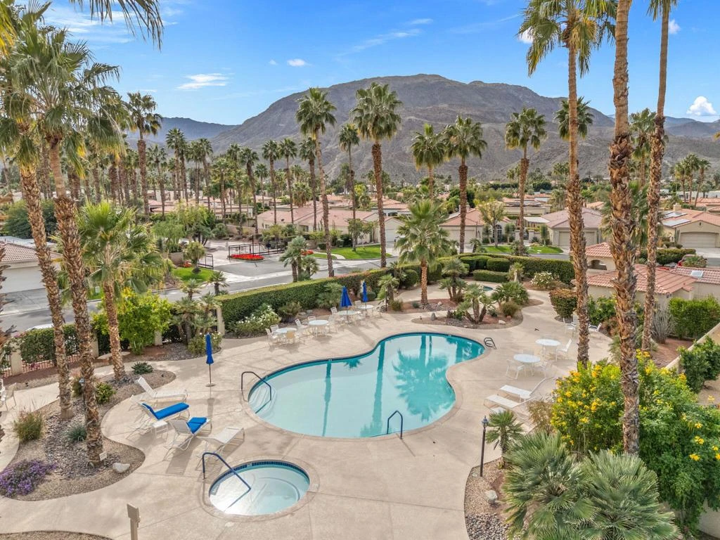 This beautifully maintained home is located in exclusive gated community of the Estates of Rancho Mirage. This home features a custom stone surround fireplace, updated kitchen with custom tile backsplash, granite counters, mostly stainless appliances . Open floorplan with custom plantation shutters throughout. Both bathrooms have been updated. Primary bath with new custom cabinets, granite counters, custom lighting, and new tile surround shower and custom lights. 2nd bath with granite counters, and custom light fixtures. Community features 2 swimming pools. Great location near shopping and restaurants.