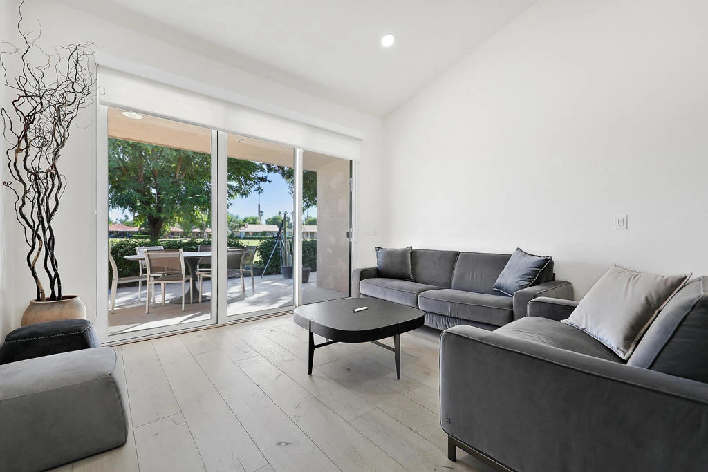 Step into style and comfort in this beautifully updated home, where every detail has been thoughtfully curated for modern living. The fully remodeled kitchen is a showstopper, featuring white quartz countertops, sleek modern-contemporary soft-close cabinets and drawers, and high-end finishes that make both everyday meals and entertaining a joy.Both bathrooms exude luxury with floating vanities topped with white quartz, modern soft-close cabinetry, and contemporary fixtures, including updated toilets. The primary bath offers a spa-like retreat with elegant ceramic tile on the shower and walls, complemented by tasteful tile flooring.Enjoy a cohesive, elevated aesthetic throughout the home with modern engineered wood flooring, custom roll-up window treatments, with a blackout shade in the primary bedroom for restful nights. Recessed and dimmable lighting allows you to set the perfect ambiance in every room, while new doors add to the fresh, modern feel.Outdoor spaces are equally refined, with slate tile in both the front courtyard and rear patio, offering durable beauty and low-maintenance style.This spacious condo boasts soaring vaulted ceilings, abundant natural light, and breathtaking views with mountains in the front and sweeping golf course vistas from the back patio.Experience the best of desert living at Sunrise Country Club, an iconic gated community in the heart of Rancho Mirage. Tucked away in the scenic Coachella Valley, this peaceful enclave blends luxury and natural beauty with lush landscaping and a picturesque 18-hole executive golf course.Residents enjoy access to 21 pools, 19 spas, 9 tennis courts, and active Pickleball and Bocce clubs, along with a newly renovated fitness center, clubhouse, and dining room. Whether you're indulging in a gourmet dinner or a laid-back Sunday brunch, the stylish Mixx Lounge offers the perfect setting.This move-in-ready home blends form and function, ideal for buyers seeking contemporary design, comfort, and convenience. Don't miss your chance to own this tastefully upgraded gem!