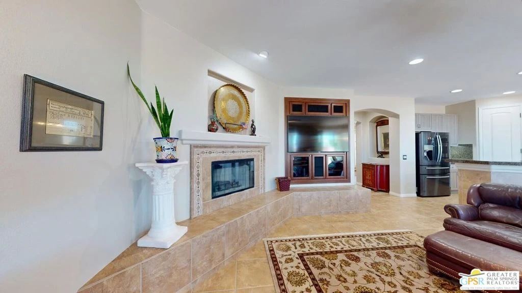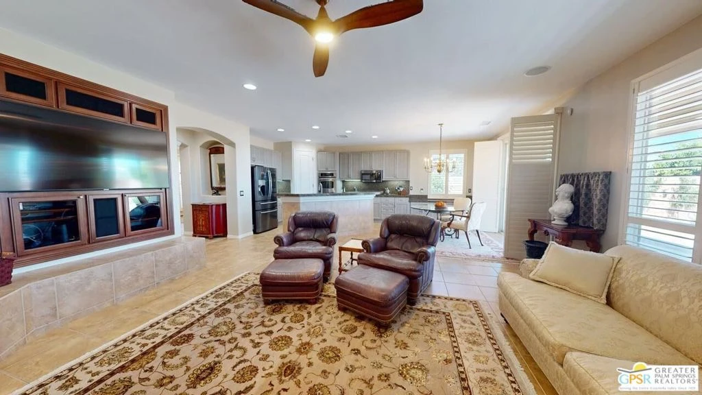 Beautifully maintained 3 Bedroom 3 Bath Tuscany of Rancho Mirage Home features owned solar - one system for the home and the other for the saltwater pool and spa. Custom tile floors throughout as well as plantation shutters and updated baths. Solar tube in hallway, baths, laundry room and garage. The Chef's Kitchen includes custom cabinets featuring soft close drawers and doors. The Black Stainless and Stainless Steel appliances include the refrigerator, dishwasher, microwave and double ovens - one with convection. Granite tile counters are a highlight for the spacious kitchen with breakfast bar. The adjacent Great Room with 9 foot ceilings includes the fireplace with wall switch control and the built-in TV and Entertainment center. Beyond the Great Room is the slider to the extensive rear patio that leads to the saltwater pool and spa with waterfall into the large free form pool. Desert landscaping throughout makes for easy maintenance and the mountain views to the north and east are beautiful. Flanking one side of the pool are three 35 foot tall Palm Trees. Heading down the hall from the main entry, the first door on the right leads to the in home Laundry Room with sink and then the entrance into the casita with it's own private entry from the front patio - the views of San Jacinto are stunning. The casita also includes it's own attached and updated bathroom. Further down the hall is access to the two car attached garage and the updated hall bath. Further along the hall there is access to the 2nd Bedroom which is currently being used as an at-home office with hardwood furniture - desk, dresser, and open closet wood shelving and cabinetry. Finally, around the corner is the entry into the Primary Bedroom Suite with the attached Primary Suite Bath. The Bath features the stall shower, dual vanities, soaking tub, water closet and a large closet. There is even a door to access the rear pool patio from this spacious suite as well. Tuscany features a gated entry, play ground, dog park and a fenced pool and spa. Why not make this beautiful home your new home today!