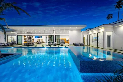 Designed by Lance O'Donnell, AIA, of O2 Architecture, this architecturally significant residence is a refined modern desert compound set against the mountains of Rancho Mirage. Featured across multiple architectural and design publications, the home carries a quiet pedigree expressed through thoughtful scale, light, and proportion.Spanning approximately 5,119 square feet on a generous 0.7-acre lot, the estate is composed of three separate structures, creating a private, compound-like setting ideal for hosting, multigenerational living, or guests who value independence and privacy. The flexible layout offers seven bedrooms and seven bathrooms, allowing the home to adapt effortlessly to both everyday living and large-scale entertaining.Architectural details define the experience throughout. A striking floating ceiling introduces a sense of volume and lightness, while walls of glass and intentional orientation invite abundant natural light, blurring the line between indoors and out. The result is an atmosphere that feels open, calm, and deeply connected to its desert surroundings.Resort-level amenities elevate the lifestyle, including a 25m lap pool designed for both fitness and leisure, additional pools framed by new decking, and outdoor living spaces enhanced by misters for warm desert days. Indoors, a state-of-the-art private theater room offers a cinematic retreat, complemented by a whole-home sound system and a comprehensive home security system for comfort and peace of mind. A dedicated sauna completes the experience, adding a restorative layer to this desert sanctuary.Set within a highly desirable enclave of Rancho Mirage, the property enjoys proximity to world-class dining, golf, and entertainment, while maintaining the tranquility of a mountainside desert oasis, offering a rare balance of seclusion, views, and architectural presence.