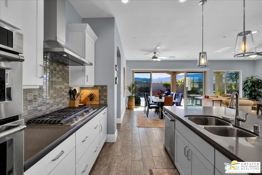Highly desirable Phase 2, Plan 5 Haven floorplan with a charming Spanish facade and coveted SIDE COURTYARD, perfectly positioned to capture sweeping PANORAMIC MOUNTAIN VIEWS with OWNED SOLAR. This beautifully upgraded 2-bedroom, 2-bath home with den/flex space offers an exceptional blend of style, comfort, and indoor-outdoor living. From the moment you enter, you'll appreciate the thoughtful upgrades throughout, including 7-inch baseboards, an interior archway package, and brushed nickel hardware and fixtures. The heart of the home is the stunning kitchen, featuring upgraded cabinetry with DOVETAIL JOINERY AND SOFT-CLOSE DRAWERS, 42-inch upper cabinets with crown molding, an EXECUTIVE ISLAND WITH ADDITIONAL STORAGE, quartz countertops with a TRIPLE-EDGE DETAIL, glass tile backsplash, pendant lighting, and stainless steel appliances with convection microwave and oven. The open great room is filled with natural light and showcases EXPANSIVE MOUNTAIN VIEWS, enhanced by upgraded dual center sliding glass doors that open seamlessly to the covered patio. The primary suite has been EXPANDED WITH THE BAY WINDOW OPTION, adding square footage and additional windows to fully enjoy the views, along with a TRAY CEILING UPGRADE for added height and elegance. The spa-inspired ensuite bath offers dual vanities with upgraded quartz countertops, designer wall sconces, brushed nickel fixtures, a CUSTOM ZERO-THRESHOLD WALK-IN SHOWER with bench seating and grab bar, and a spacious walk-in closet. Step outside to your private backyard retreat, where a CUSTOM SALTWATER SPOOL WITH TANNING SHELF AND ARTIFICIAL CURRENT SYSTEM is framed by tasteful hardscape and softscape, all set against dramatic mountain backdrops. The side courtyard off the kitchen provides yet another outdoor space - ideal for dining, entertaining, or relaxing under the desert sky. The secondary bedroom, located at the front of the home, offers privacy for guests and convenient access to the secondary bath with an upgraded glass-enclosed shower. The versatile den/flex space is outfitted with a CUSTOM BUILT-IN DESK and wall cabinetry, tray ceiling, and a large window with views of the courtyard and mountains - perfect for a home office or creative space. Additional highlights include an EXPANDED LAUNDRY ROOM with generous counter and cabinet storage, an OVERSIZED TWO-CAR GARAGE with room for storage, workshop space, or larger vehicles. Located within the prestigious 55+ Del Webb Rancho Mirage community, residents enjoy access to a state-of-the-art CLUBHOUSE with pool, spa, fitness center, tennis, PICKLEBALL, and a full calendar of social activities. HOA DUES NOW INCLUDE A PREMIUM CABLE AND INTERNET PACKAGE, adding even more value to this exceptional home.