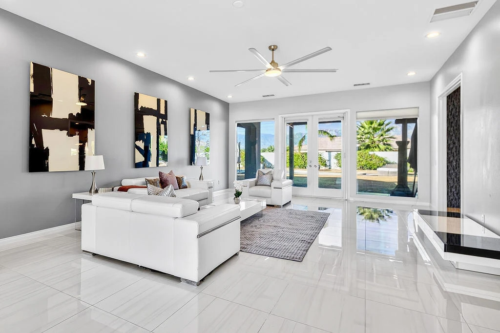 Annual lease. A luxury home on a cul-de-sac in the gated Versailles community - near Eisenhower Medical Center. This 3789 Sq Ft home has 4 bedrooms 3.5 baths and sits on a huge elevated lot with mountain views. Located in the IID lower utility cost district. Beautiful double door glass entry. Spacious open floor plan. The island kitchen has a gas cook top, granite countertops, double ovens, breakfast bar. The primary bedroom suite has a fireplace and a retreat with built-in bookcase. The over-sized back yard has covered patio, fire pit, built-in BBQ and custom saltwater pool & spa. 3-car garage. Basic tv cable, HOA fees, pool + landscape service + trash pick up service are included. Tenants pay utilities + screening fee. Owner will consider Seasonal Vacation rental terms at $11,000mo. Contact agent to schedule your personal showing