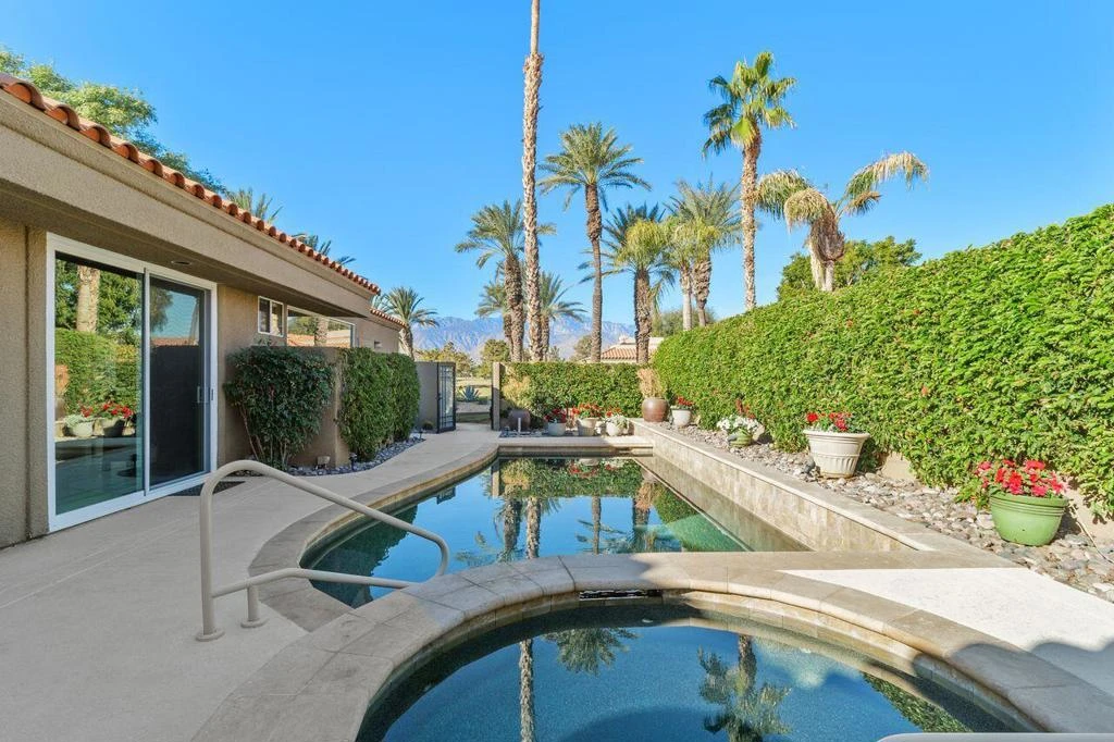 Mission Hills East, you own the land! This beautifully updated home featuring vaulted ceilings, 4 bedroom (4th bedroom used as den)+bonus room addition and 3.5 baths. The remodeled kitchen and primary bathroom are a testament to sophisticated style, with sleek finishes and attention to detail. Newly updated flooring throughout the living room, kitchen, dining room, & hallways enhance the home's bright and airy atmosphere. Enjoy breathtaking golf course and mountain views from nearly every room. The outdoor space is a true oasis, ideal for both relaxation and entertaining. Take a dip in the private Salt Water pool and spa, or relax on the expanded rear patio, where the scenic views serve as the perfect backdrop. The home's newly added Milgard Sliding doors in the kitchen, both primary bedrooms, and living room provide easy access to the outdoors. This home has been thoughtfully upgraded with brand-new kitchen cabinets, appliances, and a freshly tiled pool, new control system, new pumps, filters, and valves. The hot water heater, HVAC system, and ductwork have also been replaced. Enjoy an array of community amenities, including four pools & spas, Spectrum cable with HBO, internet, trash services, and exterior maintenance (roof, paint, landscaping). Memberships available offering golf, tennis, pickleball, croquet, and bocce are just moments away at the prestigious Mission Hills CC. Ask also about memberships to Rancho Mirage Westin Pete Dye Golf and spa resort. .
