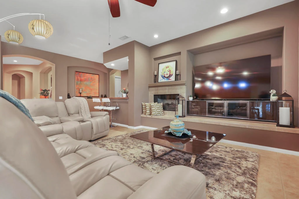 Welcome to this fabulous Tuscany Stunner! . The open layout reveals 2627sq ft of beautifully designed living space, featuring 4 spacious bedrooms and 3 full bathrooms. The gourmet kitchen is a chef's delight, featuring granite counters, pantry, island & entertaining counter, double wall ovens and a separate designer alcove with a 5-burner gas cooktop. Beautiful formal dining room, coffered ceilings, tile and wood laminate flooring, plantation shutters, fireplace and wet bar with seating. Primary master suite has dual vanities plus a make-up table, a raised oval tub, separate glass block walk-in shower, large walk-in closet and door to the patio. Bedroom 2 and 3 share a Jack and Jill shower with dual sinks and mirrored closets. There is dedicated laundry room with sink and a 2 car garage with Epoxy floors. Outside offers a private backyard oasis, featuring a Pebble-Tec saltwater heated pool with raised spa. Only 12 years old!! Covered patio with designer limestone tiles plus an awning offers plenty of shade cover. Dual zone AC and SOLAR paid for!!!!!