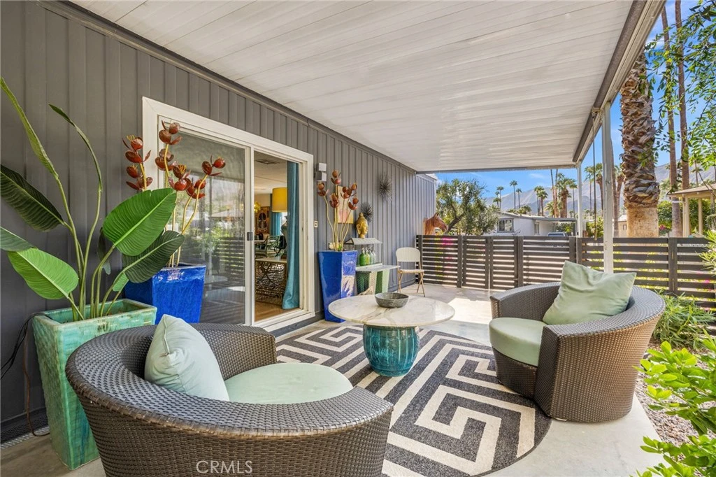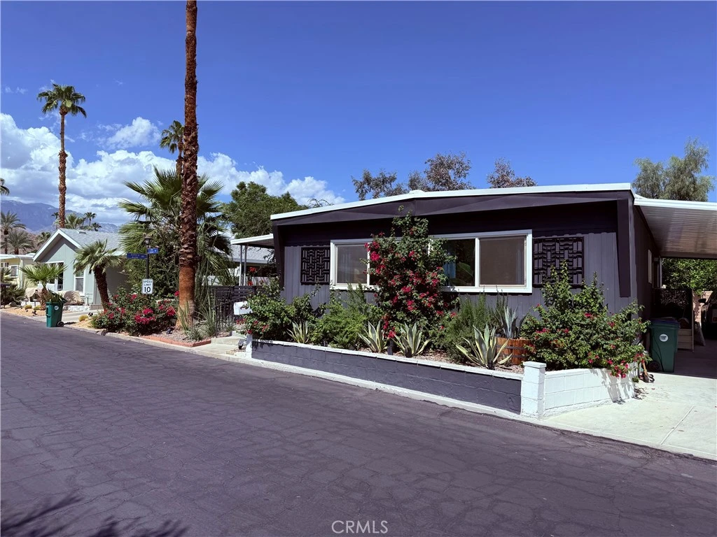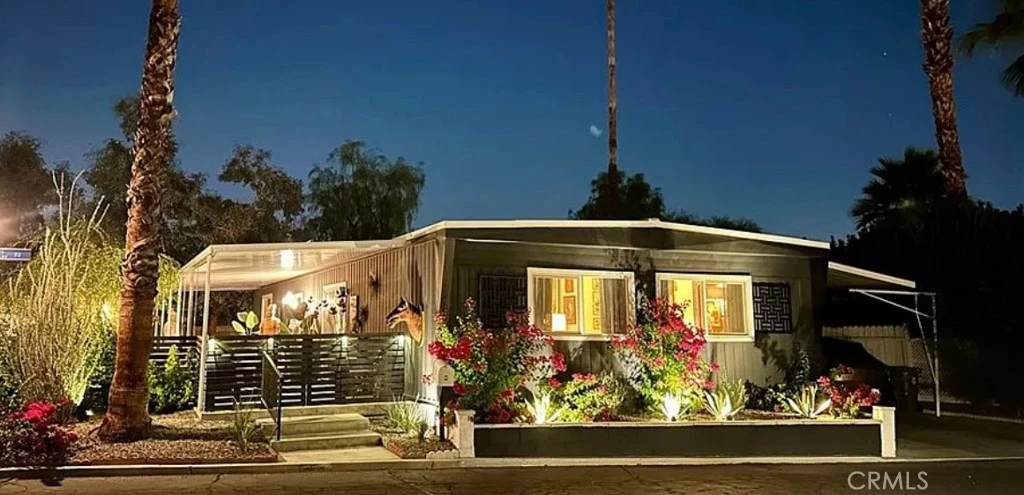 Welcome to a rare opportunity in historic Blue Skies Village, an exclusive 55+ gated community founded by Hollywood icons including Bing Crosby, George Burns, Gracie Allen, and Jack Benny. Rich in character and architectural significance, this storied enclave offers timeless charm in an intimate desert setting. This beautifully reimagined vintage residence has been completely remodeled to the highest standards and sits on one of the widest and largest lots in the community. Best of all, you own the land, there is no land lease, and property taxes are based solely on land value, resulting in remarkably low annual taxes. Inside, a designer chef’s kitchen showcases upscale appliances, custom cabinetry, and elegant quartz countertops, creating a refined yet inviting space for everyday living and entertaining. Dual pane windows, wide plank flooring, beautifully tiled bathrooms, and high-end finishes elevate the home throughout. Step outside to an expansive, gated wraparound garden with lush landscaping, exceptional privacy, stunning mountain views, and ideal sun exposure throughout the day, perfect for gatherings or peaceful relaxation. Ample parking with more than three covered spaces, accommodating up to four vehicles, adds tremendous value. The low $425 monthly HOA includes cable, internet, trash, and water, along with access to resort style amenities such as a saltwater pool and spa, fitness center, and a clubhouse designed by renowned mid-century architect William F. Cody. Ideally located adjacent to the Butler Abrams Trail and just minutes from Eisenhower Health, as well as the shopping, dining, and cultural attractions of Palm Desert and Palm Springs, this exceptional home offers history, lifestyle, and value in one extraordinary setting.